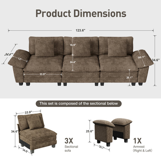 Captiva Designs 123.6" Cloud Modular Sofa, 3-Seater Deep Seat Sectional Couch for Living Room