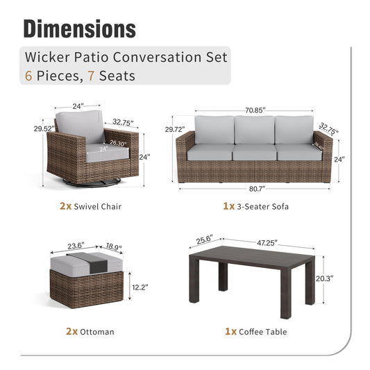 Captiva Designs 6pc Wicker Outdoor Patio Conversation Set with swivel Coffee Table and Ottoman for Backyard Deck Poolside