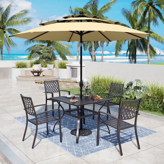 Captiva Designs 6pc Patio Mesh Top Square Steel Dining Table & Stackable Metal Chairs & Market Umbrella