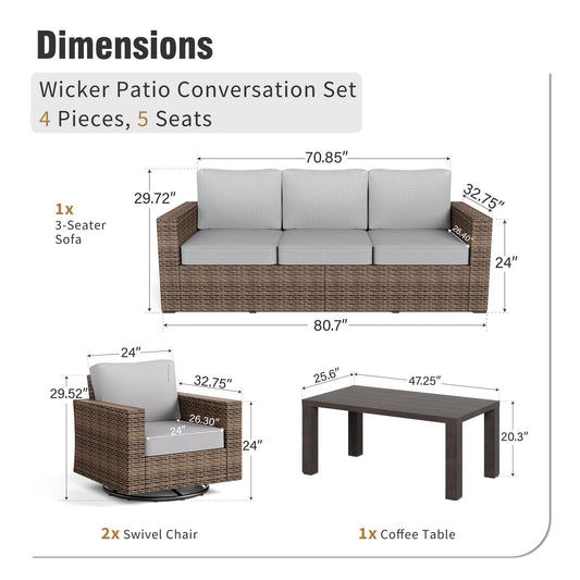 Captiva Designs 4pc Wicker Outdoor Patio Conversation Set with swivel single sofa for Backyard Deck Poolside
