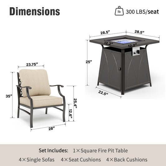 Captiva Designs 5pc Metal Patio Outdoor Conversation Fire Pit Set with Grid-back Armchairs for Garden, Poolside, Backyard