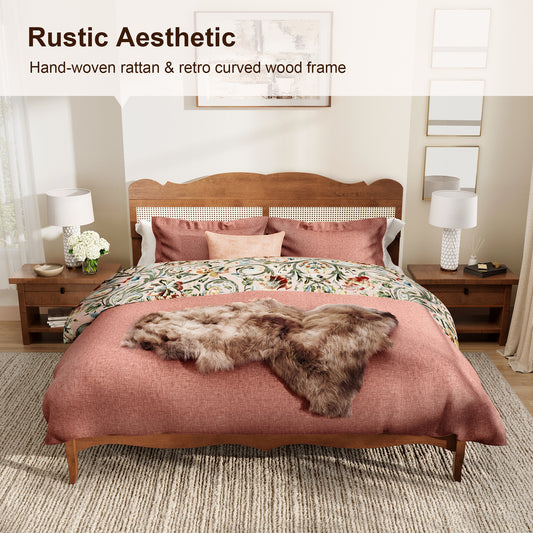 Captiva Designs Wood Platform Bed Frame with Height Adjustable Woven Rattan Headboard and Reinforced Slats Support, No Box Spring Needed