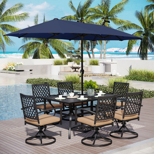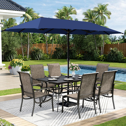 Captiva Designs 8pc Outdoor Rectangular Steel Dining Table & Breathable Sling Chairs & Market Umbrella