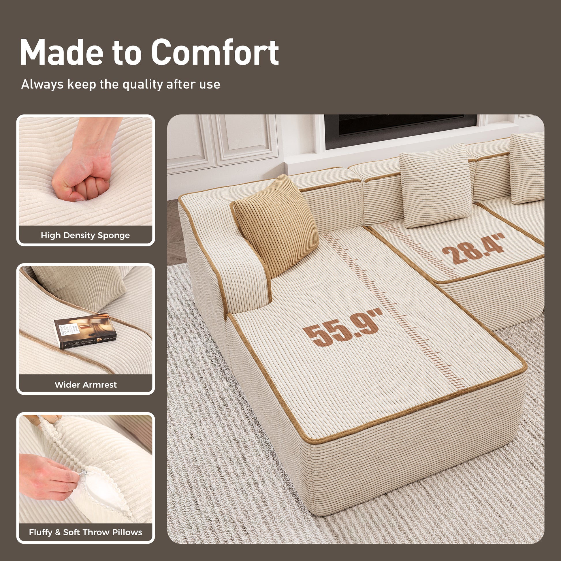 Captiva Designs 124" L-Shaped Sectional Sofa with Ottoman and 3 Pillows, 4-Seater Modular Cloud Couch for Living Room, Corduroy Fabric