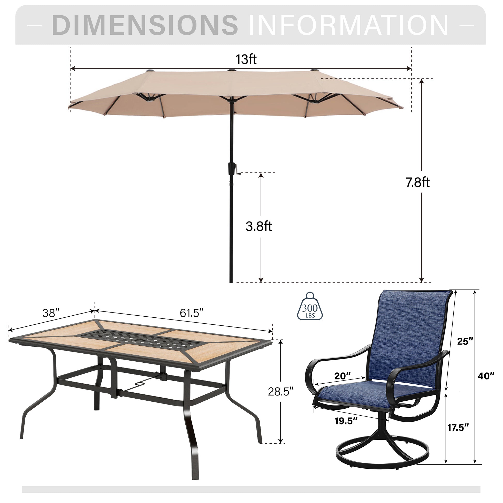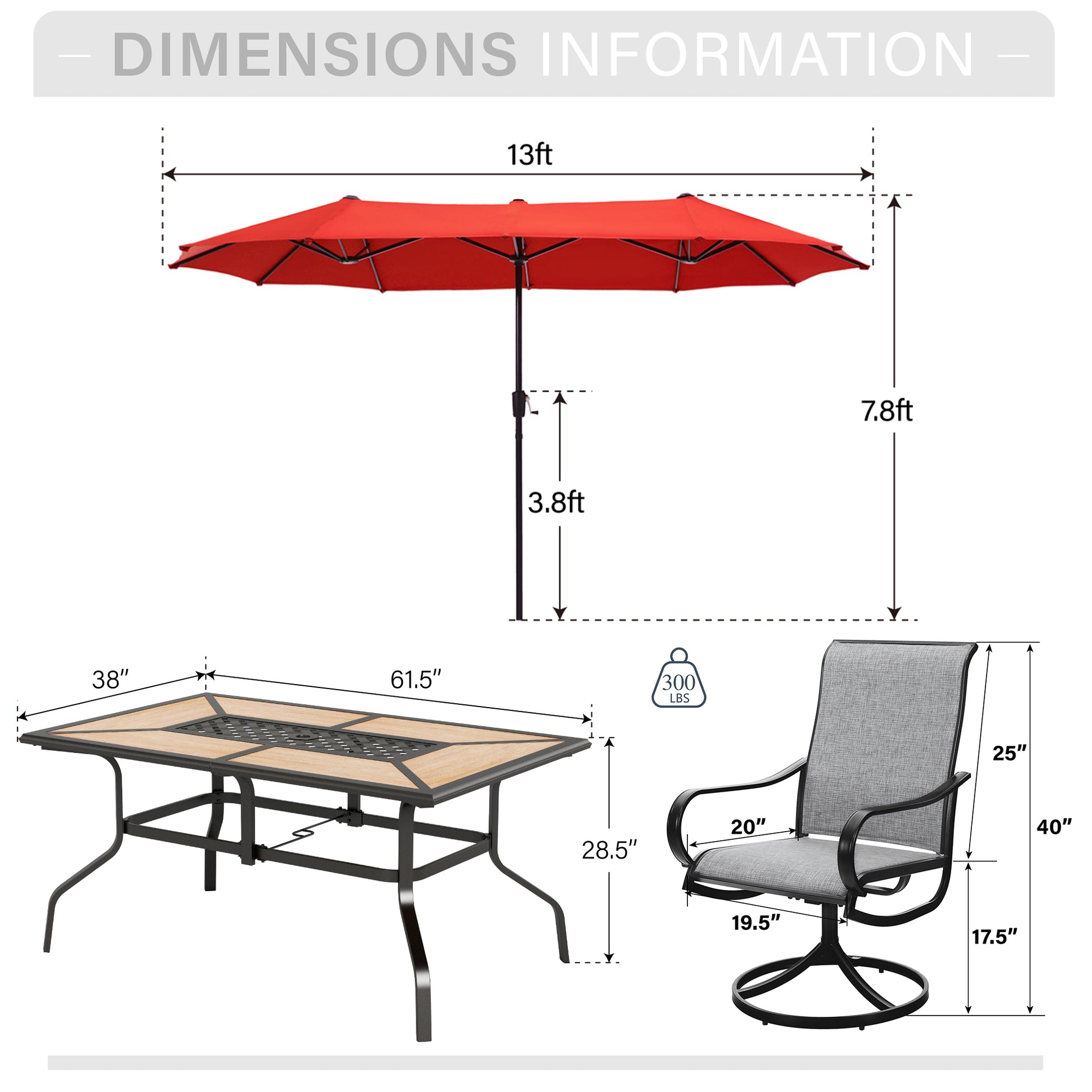 SPECIFICATION - Umbrella Dimensions: 13 Feet [Dia] x 13 Feet [L] x 6.6 Feet [W]