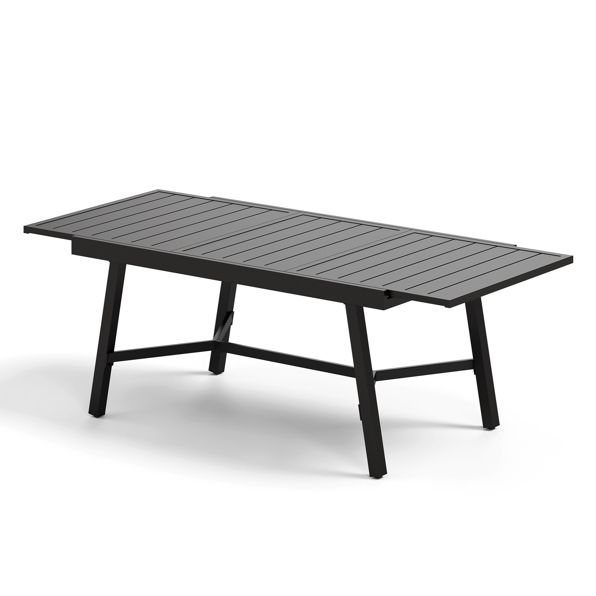 [<b>CAPTIVA DESIGNS</b>] Enhance your outdoor dining with our spacious rectangle metal table, featuring a slatted top that prevents water accumulation for easy maintenance. Equipped with a 1.7" pre-cut umbrella hole for UV protection, this table combines functionality and style. Crafted from durable E-coated and powder-coated steel, it ensures long-lasting enjoyment, while fixed ring connections provide exceptional stability. Transform your patio or backyard into an inviting space with this versatile dining table!