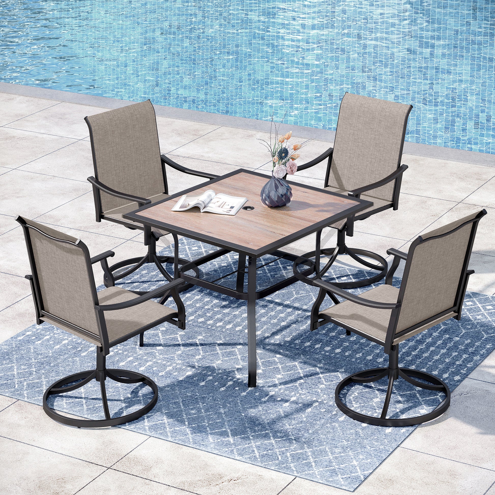 Experience stylish and comfortable outdoor dining with Captiva Designs. This 5pc steel table includes an umbrella hole and brown textilene arm chairs for added convenience and durability. Perfect for any backyard or patio, enjoy quality time while benefiting from its sturdy construction and elegant design.