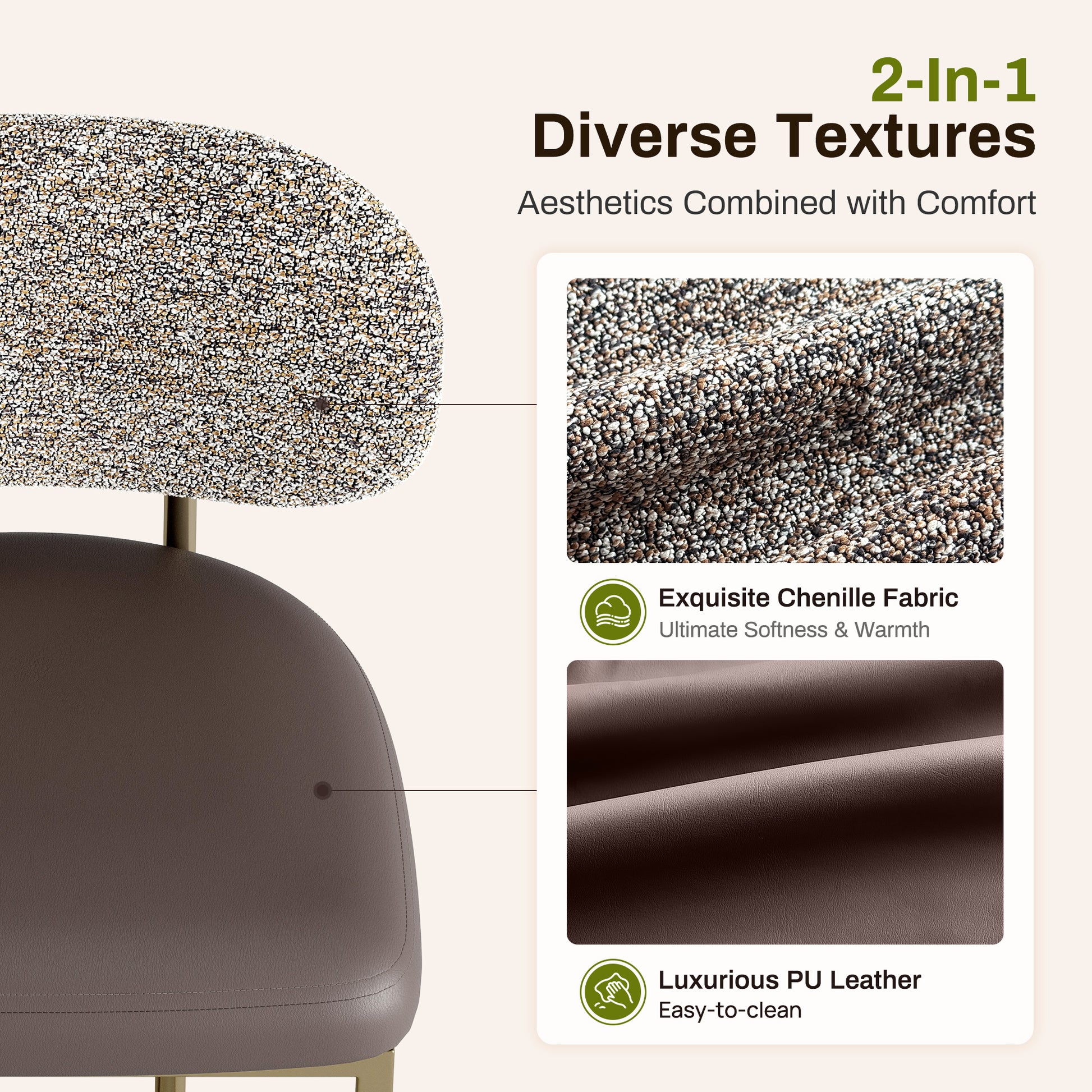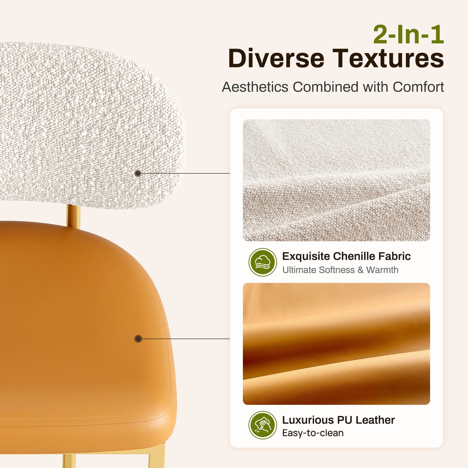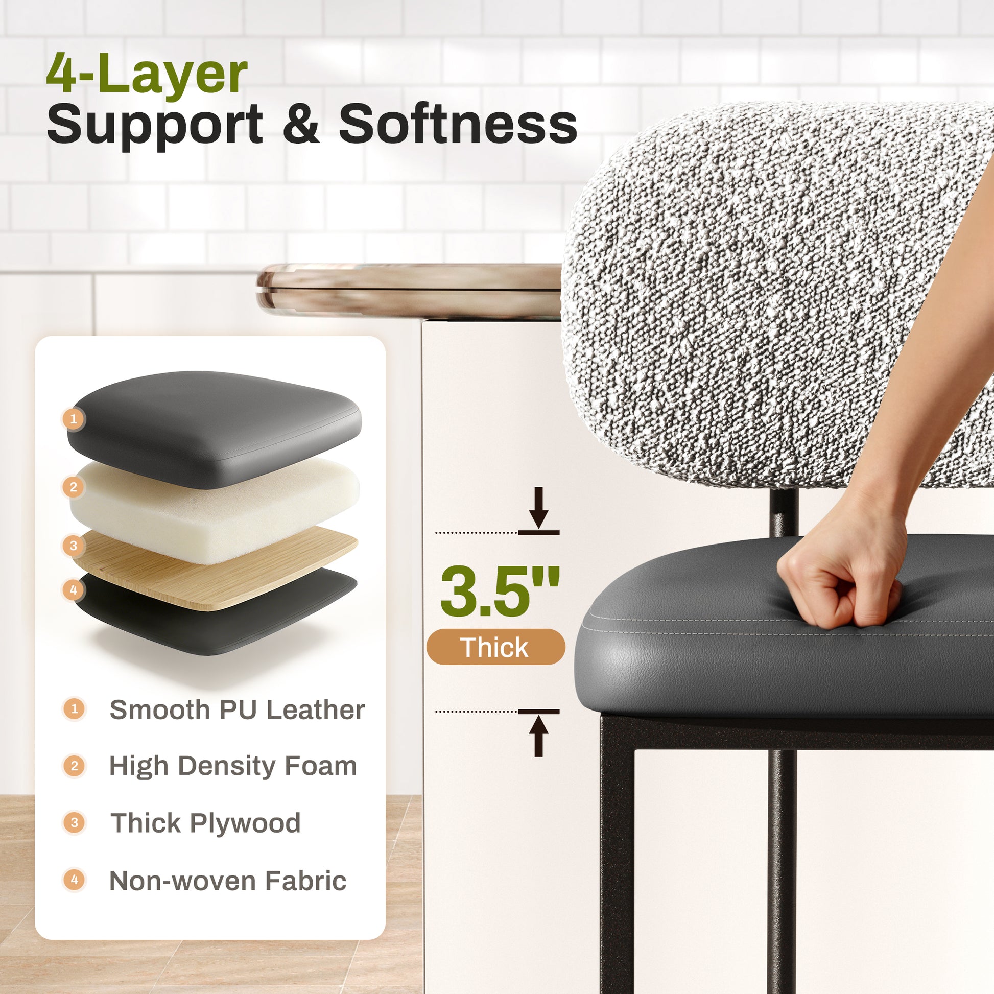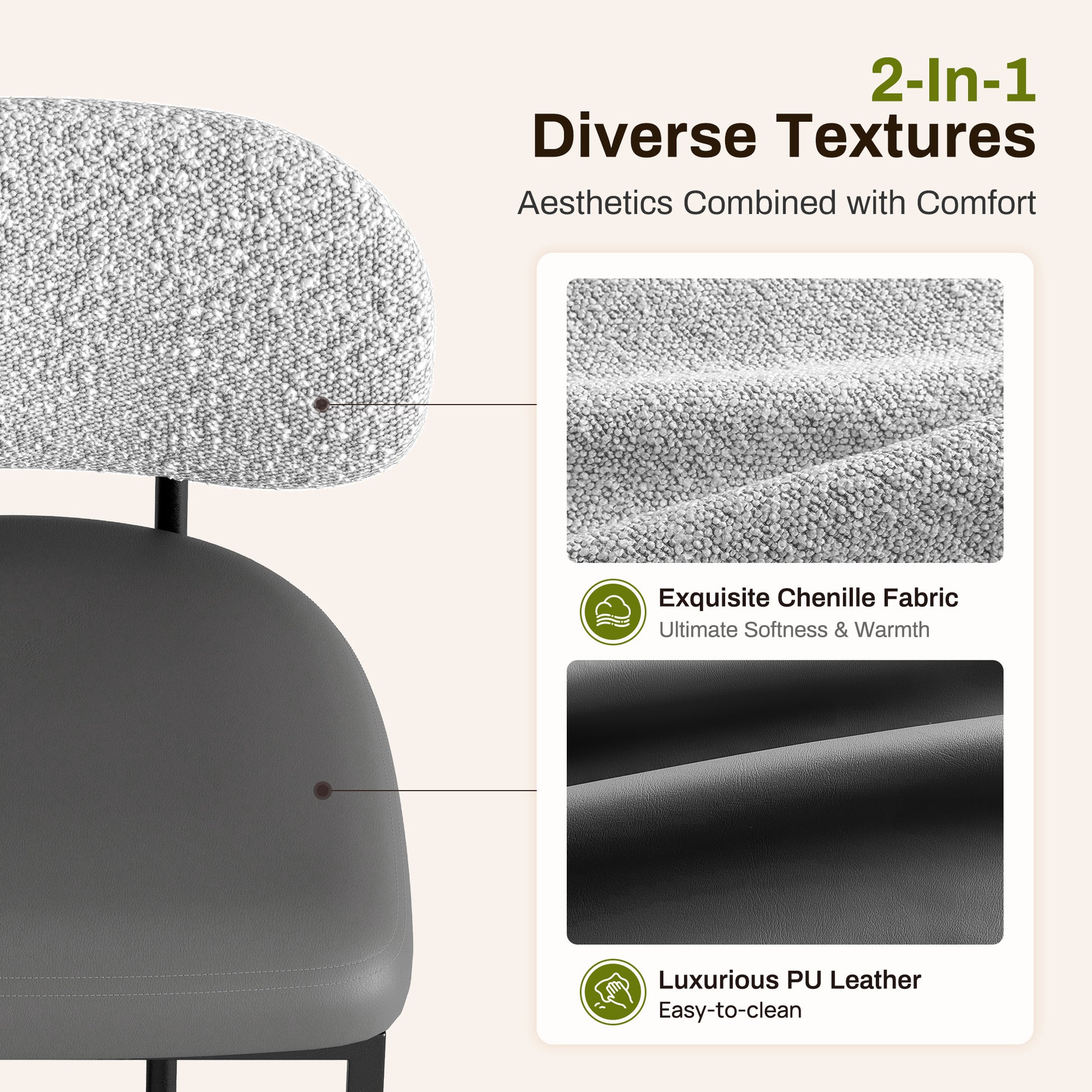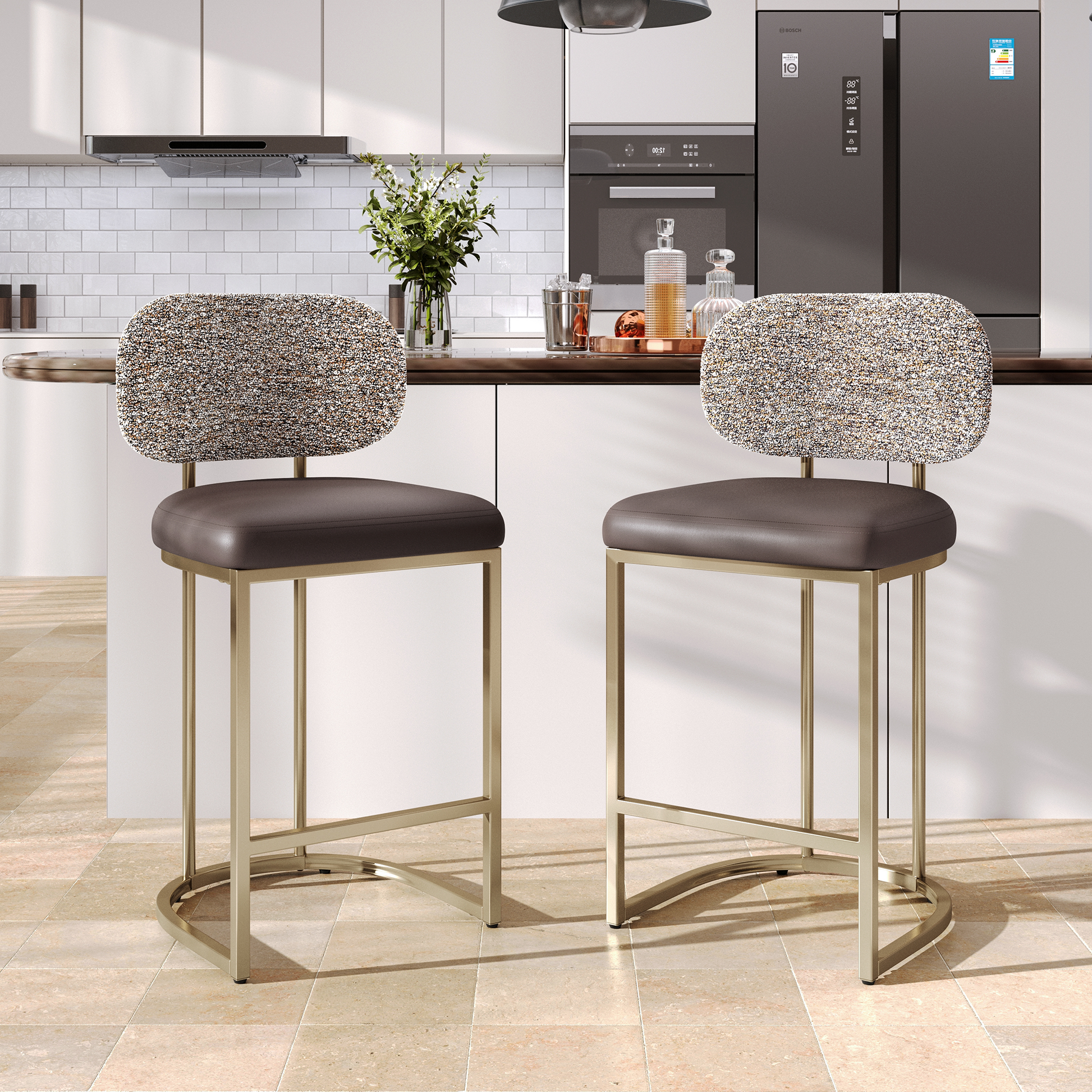 [Captiva Designs] Upgrade your kitchen or bar area with the stylish modern design of Captiva Designs’ counter-height bar stool. This stool features a spacious curved backrest that promotes good posture, while the luxurious dual-material upholstery combines soft chenille and easy-to-clean PU leather for maximum comfort. Enjoy enhanced four-layer support with high-density foam and sturdy construction that invites long, enjoyable meals. User-friendly features like a built-in footrest and adjustable foot pads provide convenience and stability. With durable radiant finish that resists chips and fading, this compact, counter-ready stool is perfect for 34–38" counters and fits seamlessly into any contemporary space. Grab yours today for a chic upgrade!
