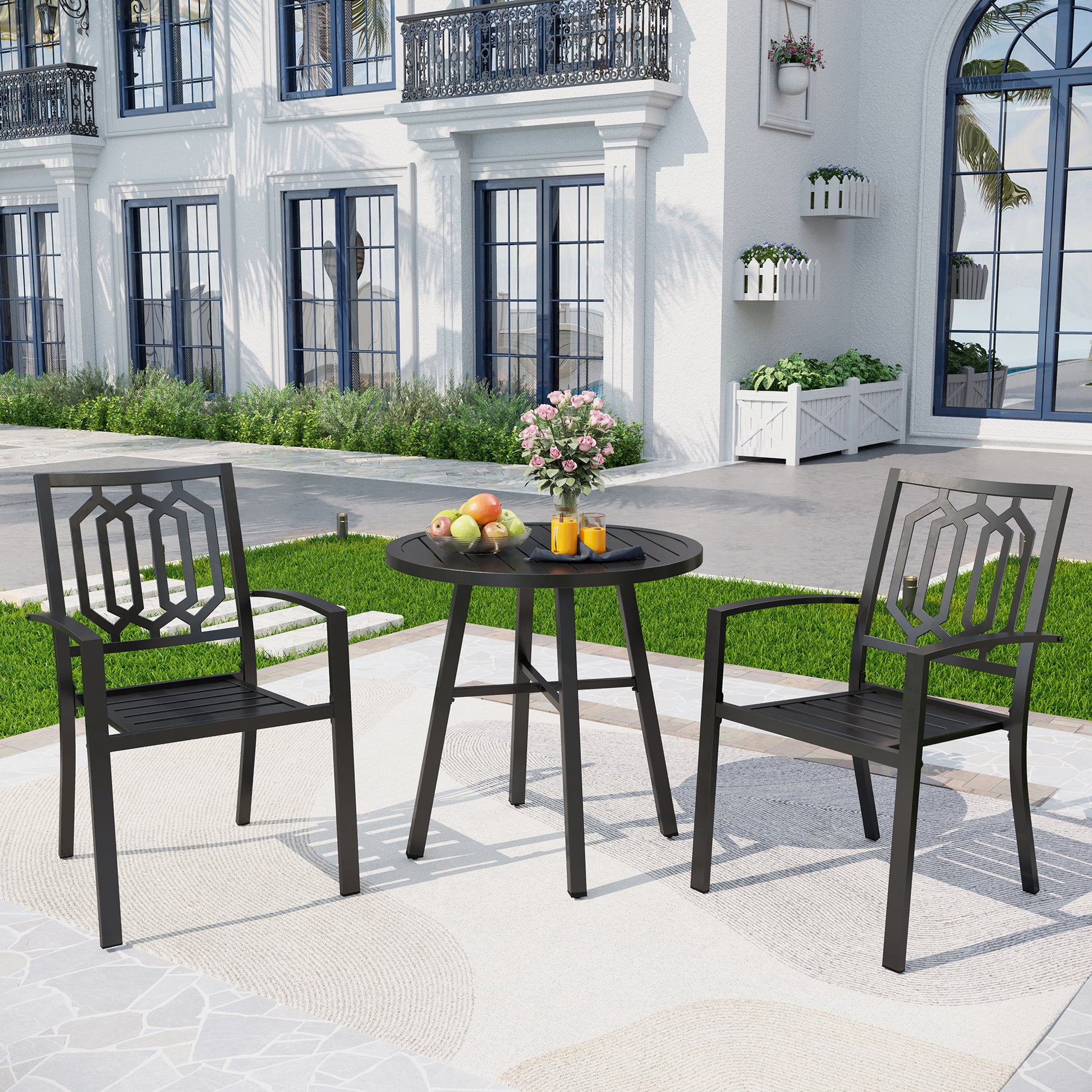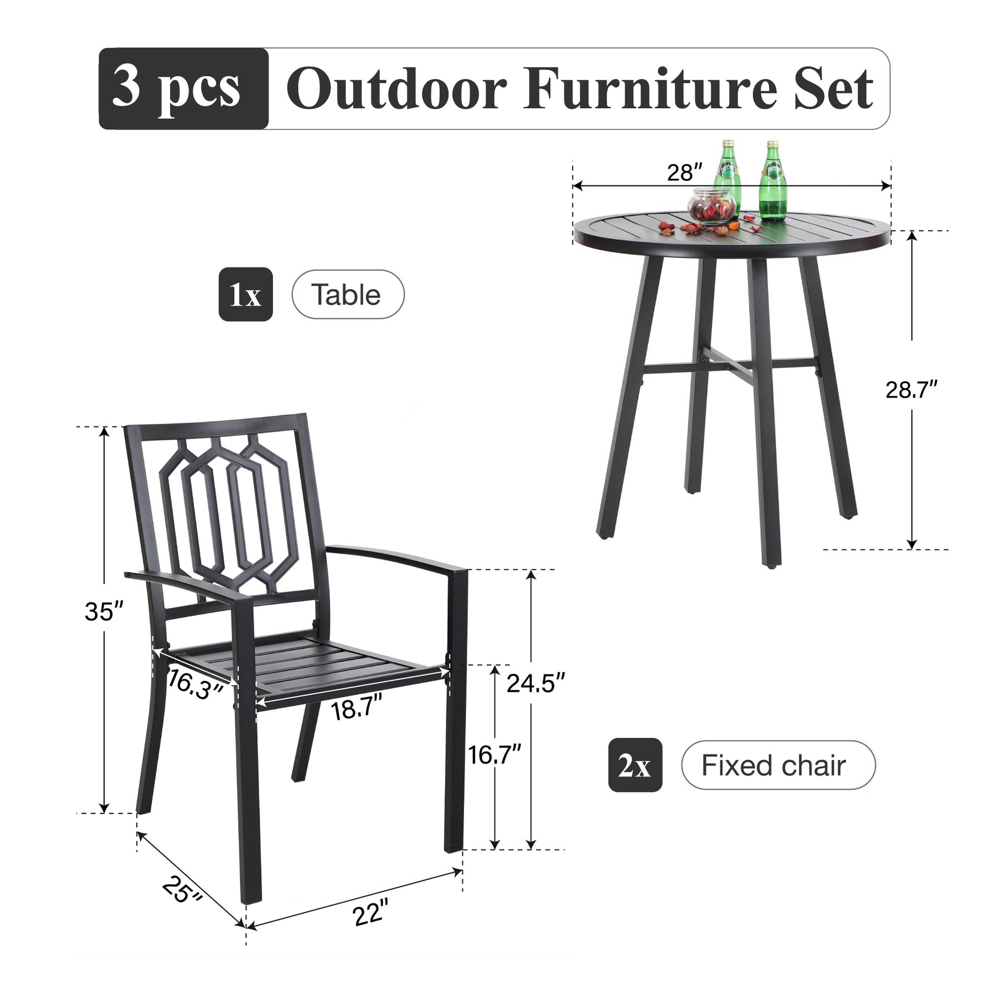 [CAPTIVA DESIGNS] Enhance your outdoor living space with the Captiva Designs 3pc Outdoor Patio Set. Experience comfort and durability by seating family and friends on sturdy metal chairs designed for lasting use. Enjoy meals and gatherings around the round slatted tabletop, which promotes easy water drainage and weather resistance.