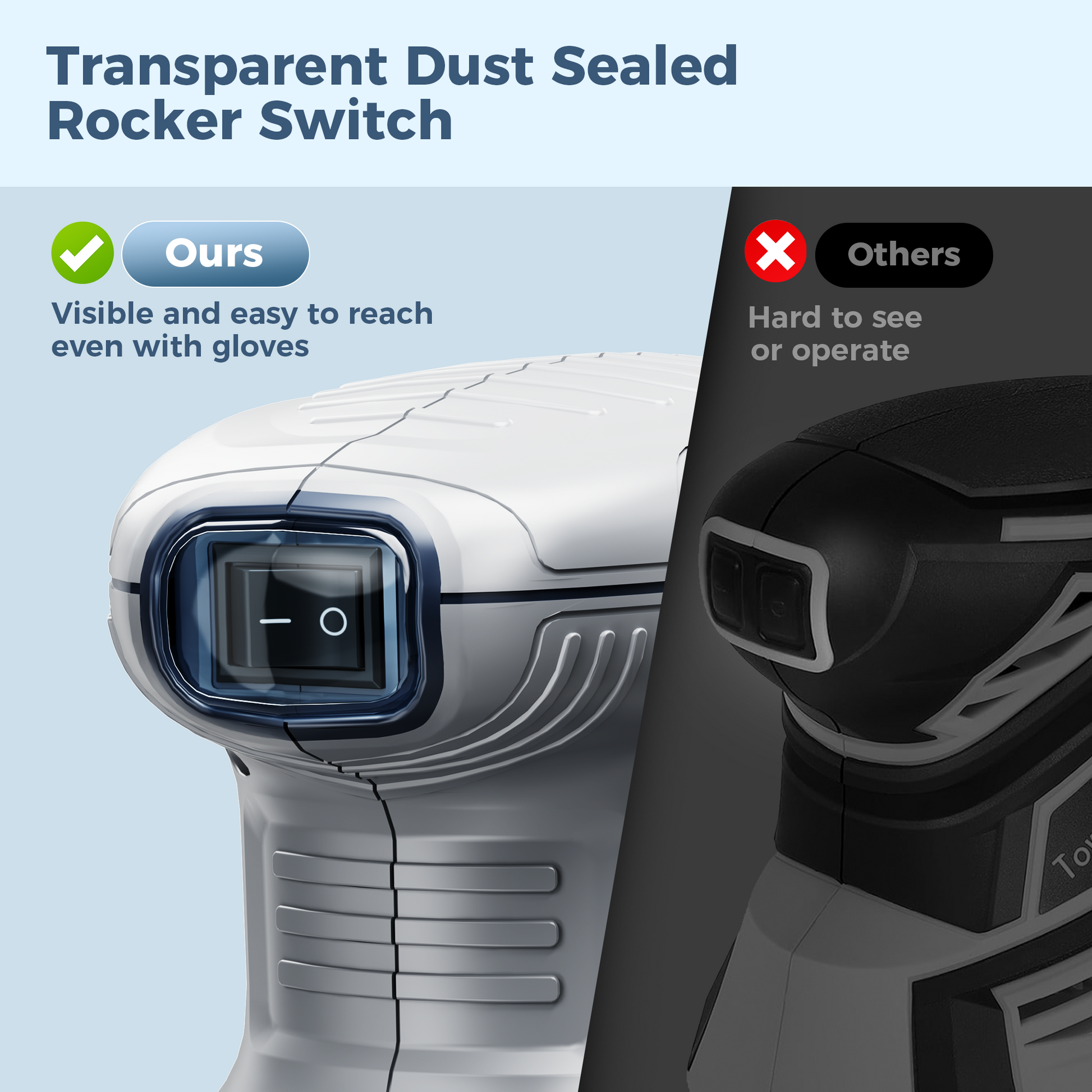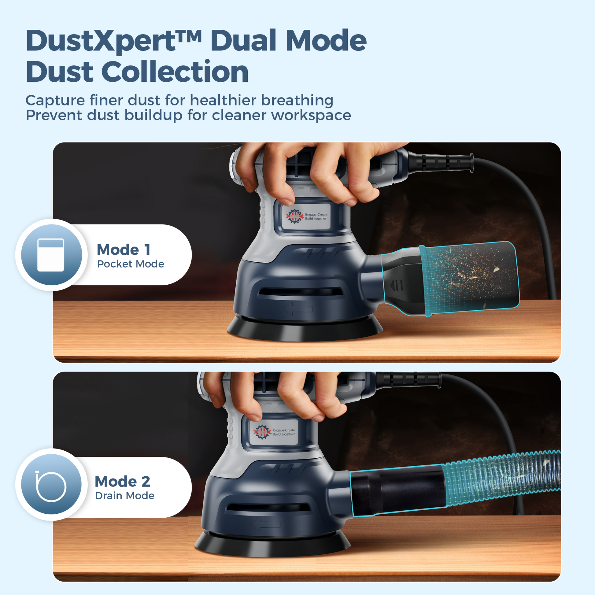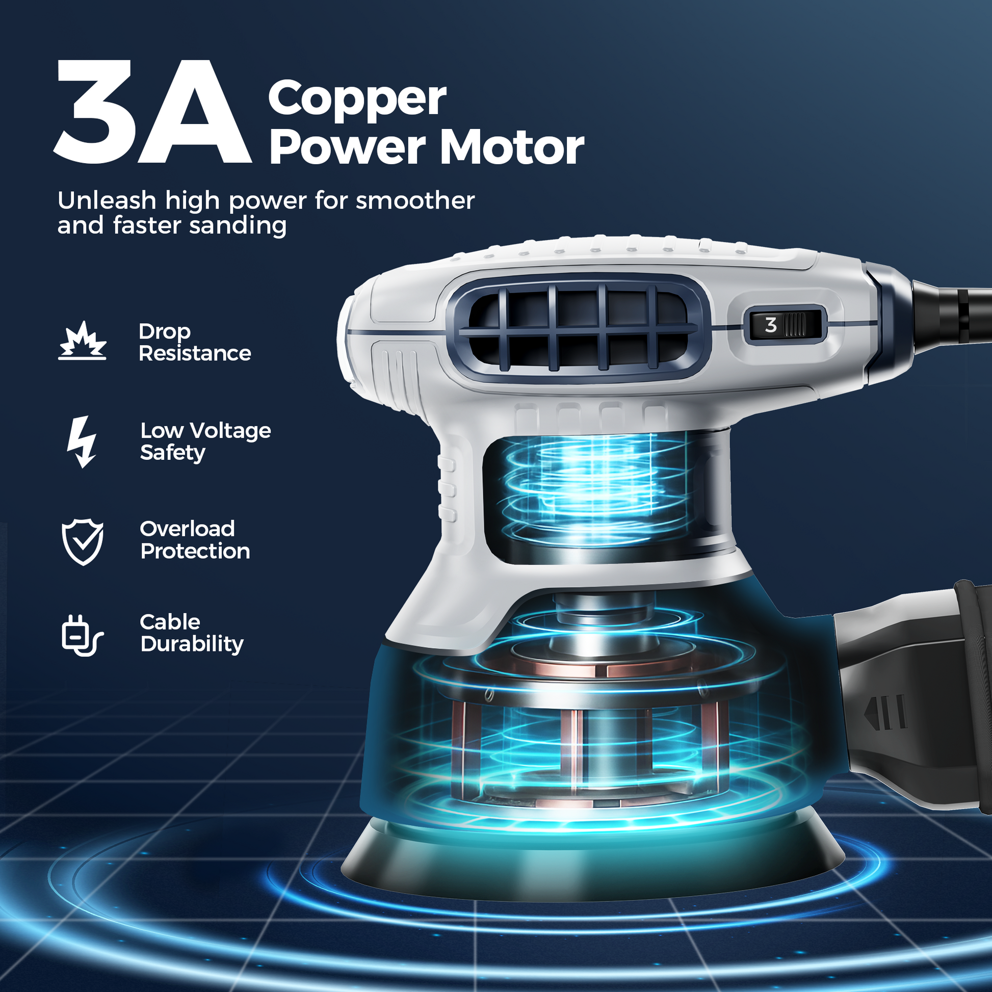 High-performance 5-inch random orbital sander with ergonomic design and low vibration for comfortable use. Equipped with 6 adjustable speeds for versatile sanding tasks and a durable pure copper brushless motor. Includes 15 sandpapers and dual dust collection options to keep your workspace clean. Ideal for woodworking, furniture restoration, and polishing projects.
