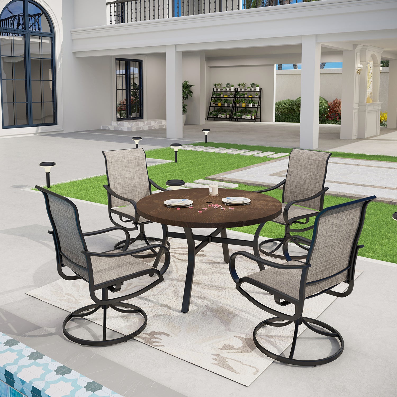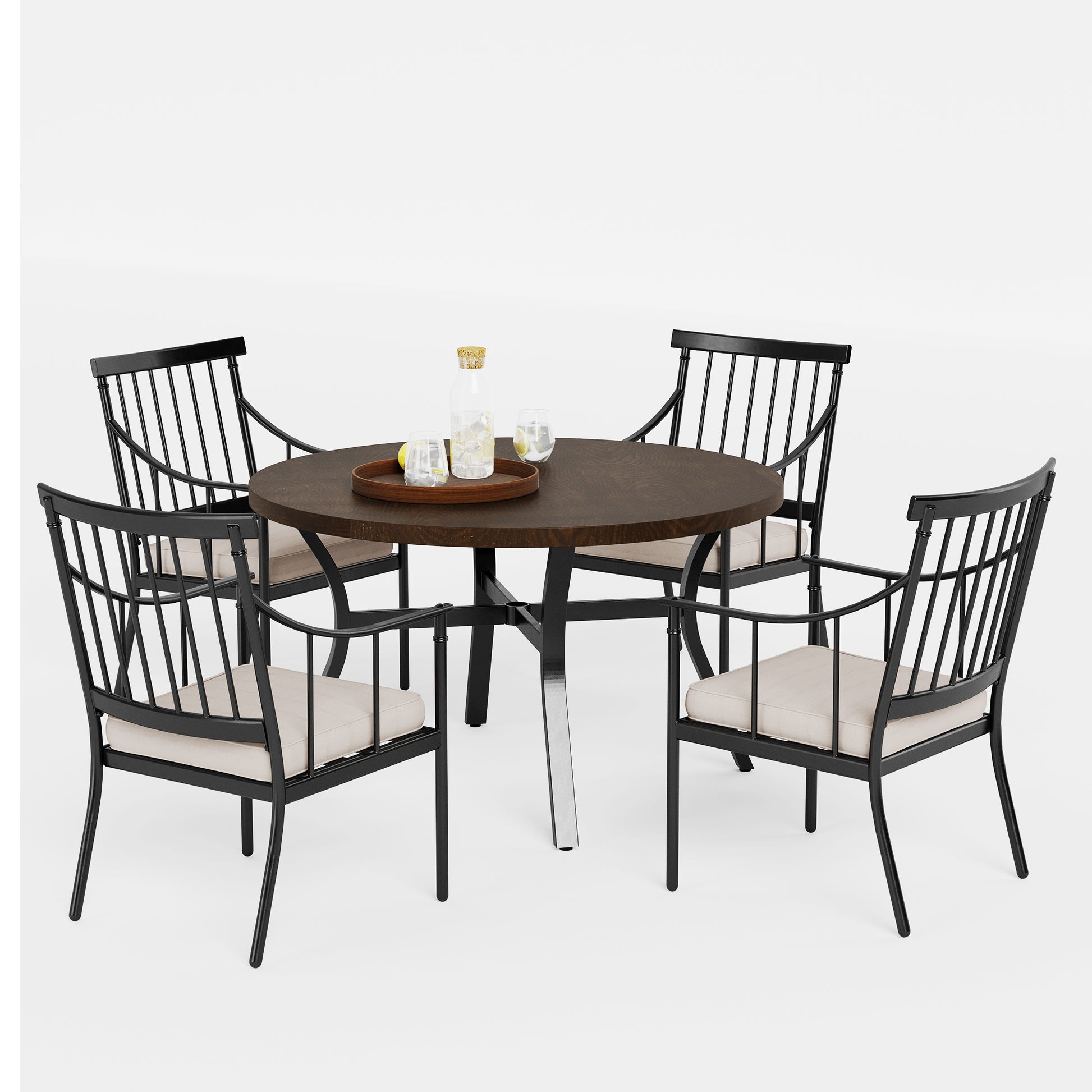 [CAPTIVA DESIGNS] Elevate your outdoor dining with this sophisticated 5-piece Captiva Designs set, featuring a striking round wood-look table with a sun-shading umbrella hole and four sturdy, low-maintenance metal chairs.
