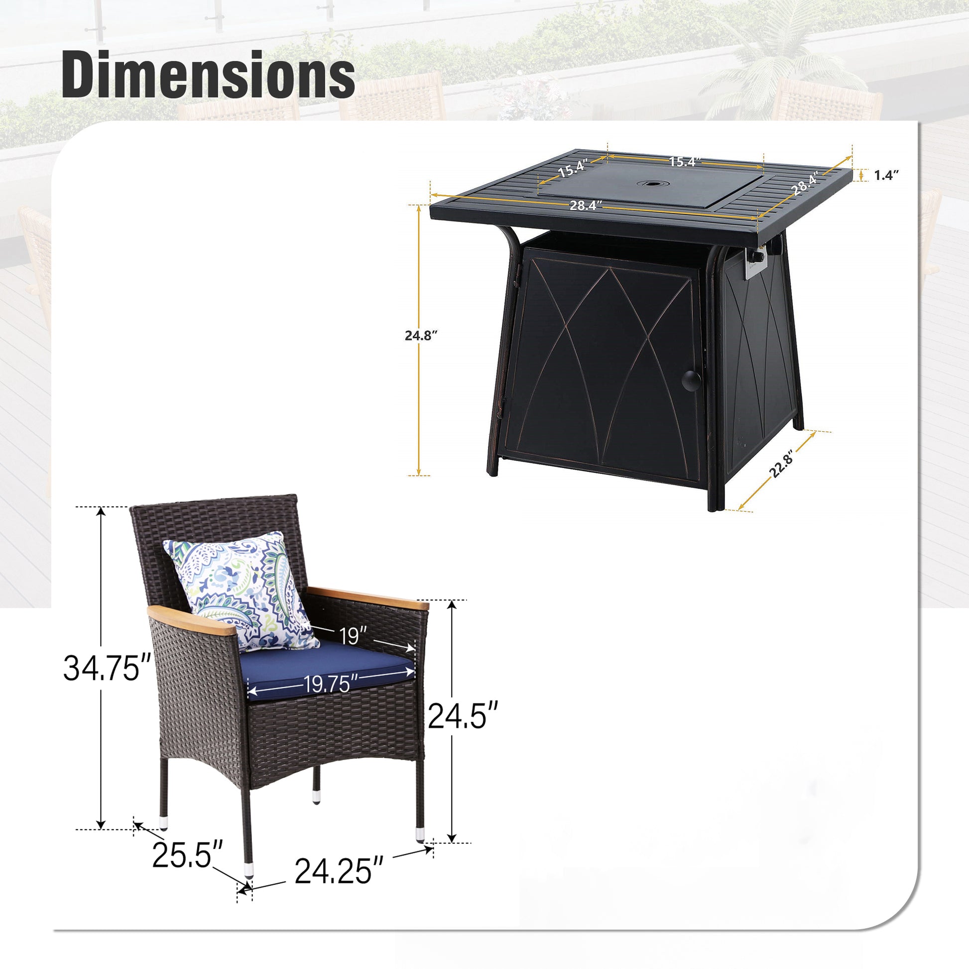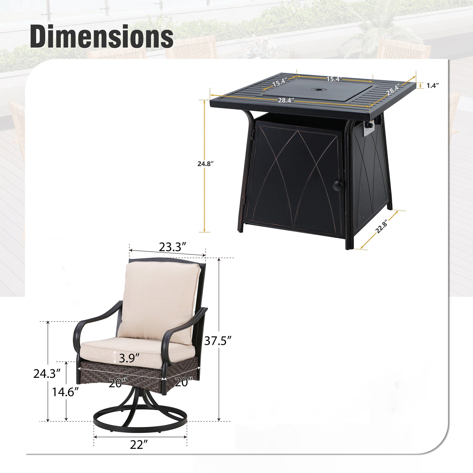 - Fire Pit Table: 24.8"H x 28.4"W x 28.4"L