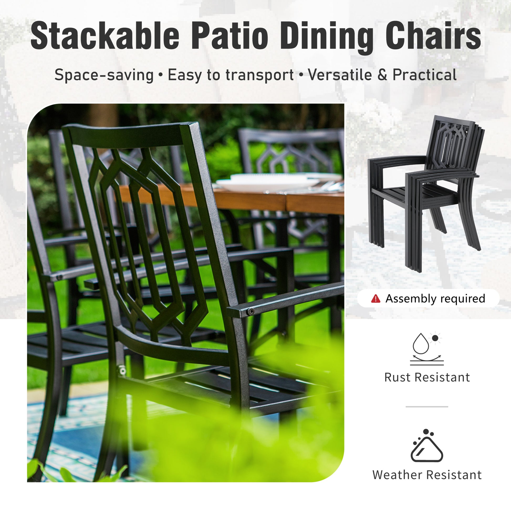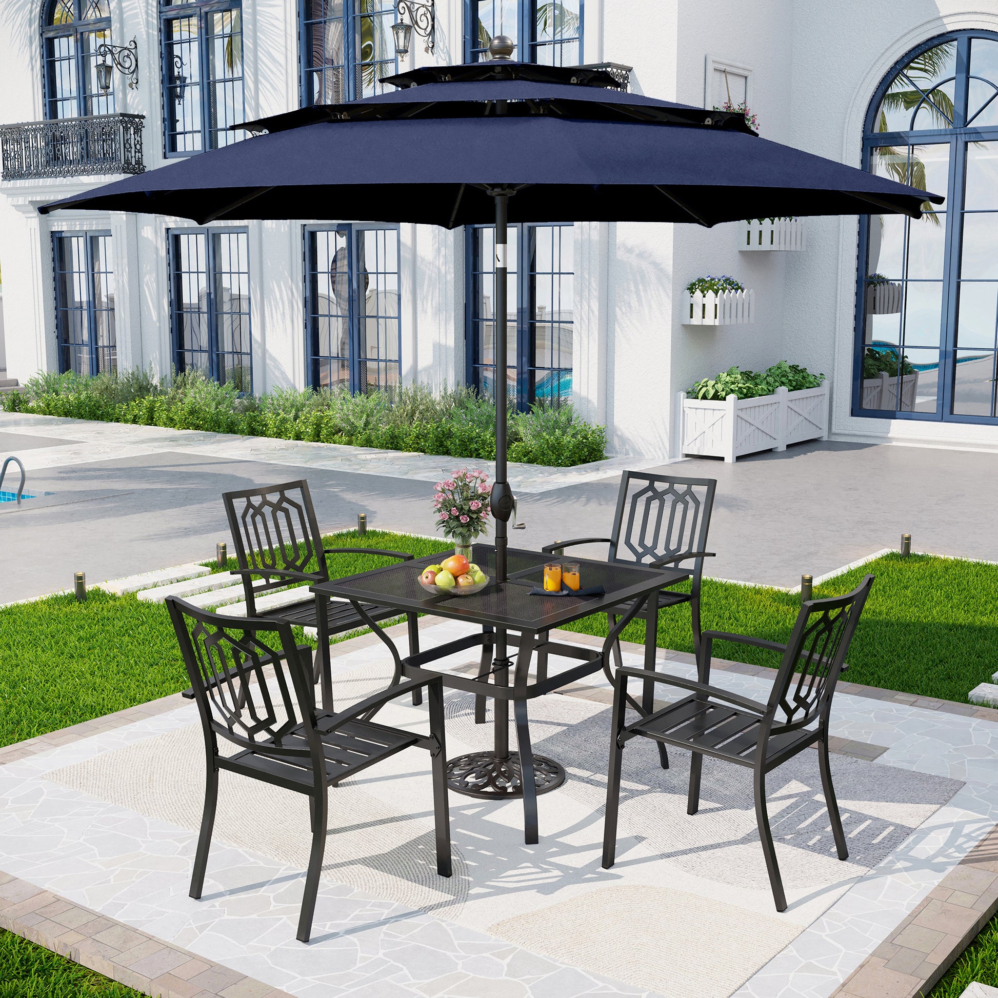 Enhance your outdoor space with the Captiva Designs 6-piece patio set. Enjoy dining with a durable mesh top square steel table that resists weather and rust. Stack the metal chairs to save space when not in use. Open the market umbrella to provide ample shade and comfort during sunny days. Maintain the set easily for lasting appeal, creating a stylish and functional environment for gatherings. Experience quality craftsmanship designed to combine practicality with modern outdoor elegance.