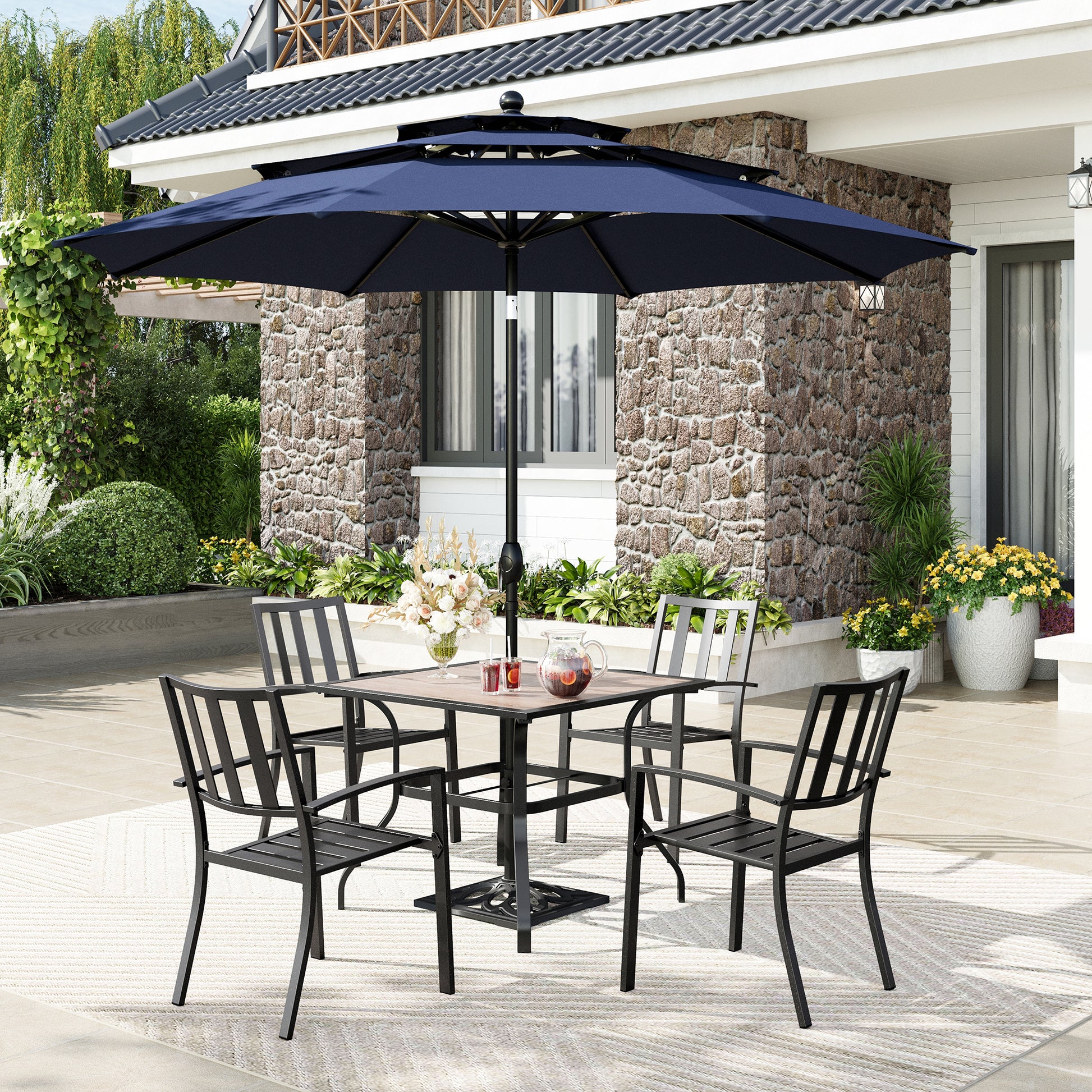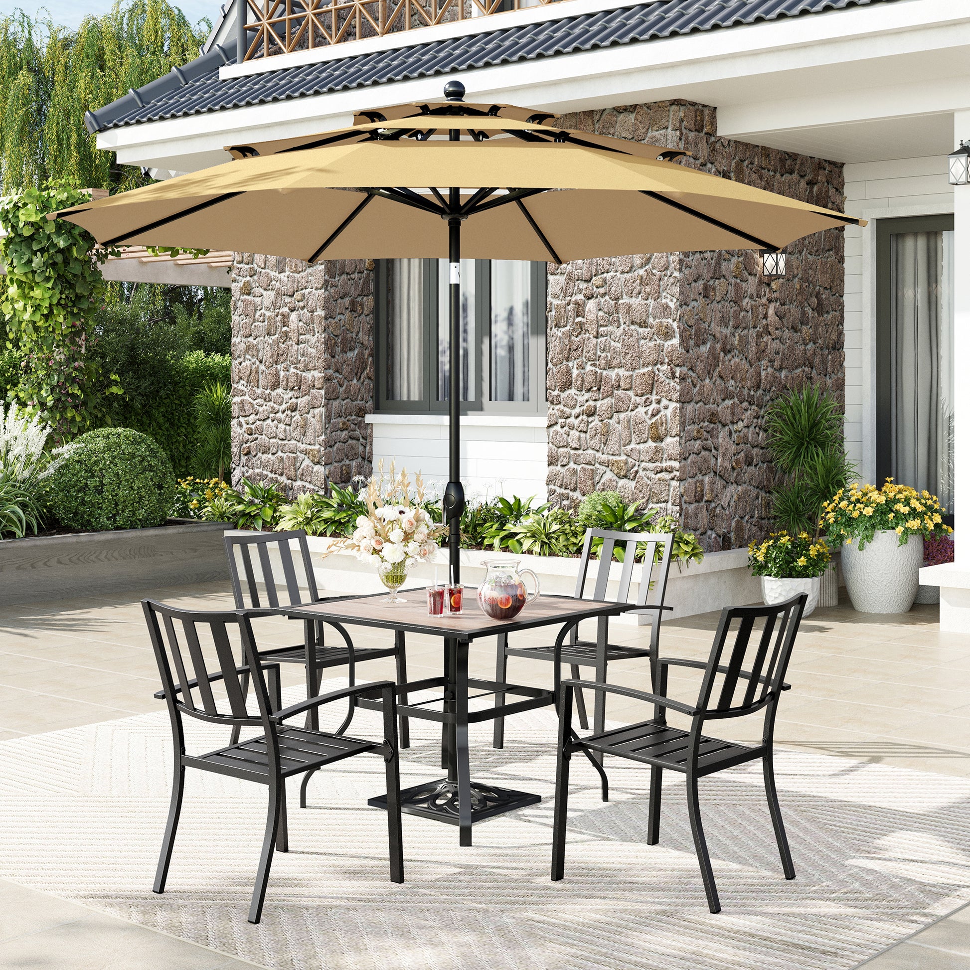 Captiva Designs 6pc Patio Square Dining Table & Stackable Fixed Chairs & 10ft 3 Tier Auto-tilt Umbrella