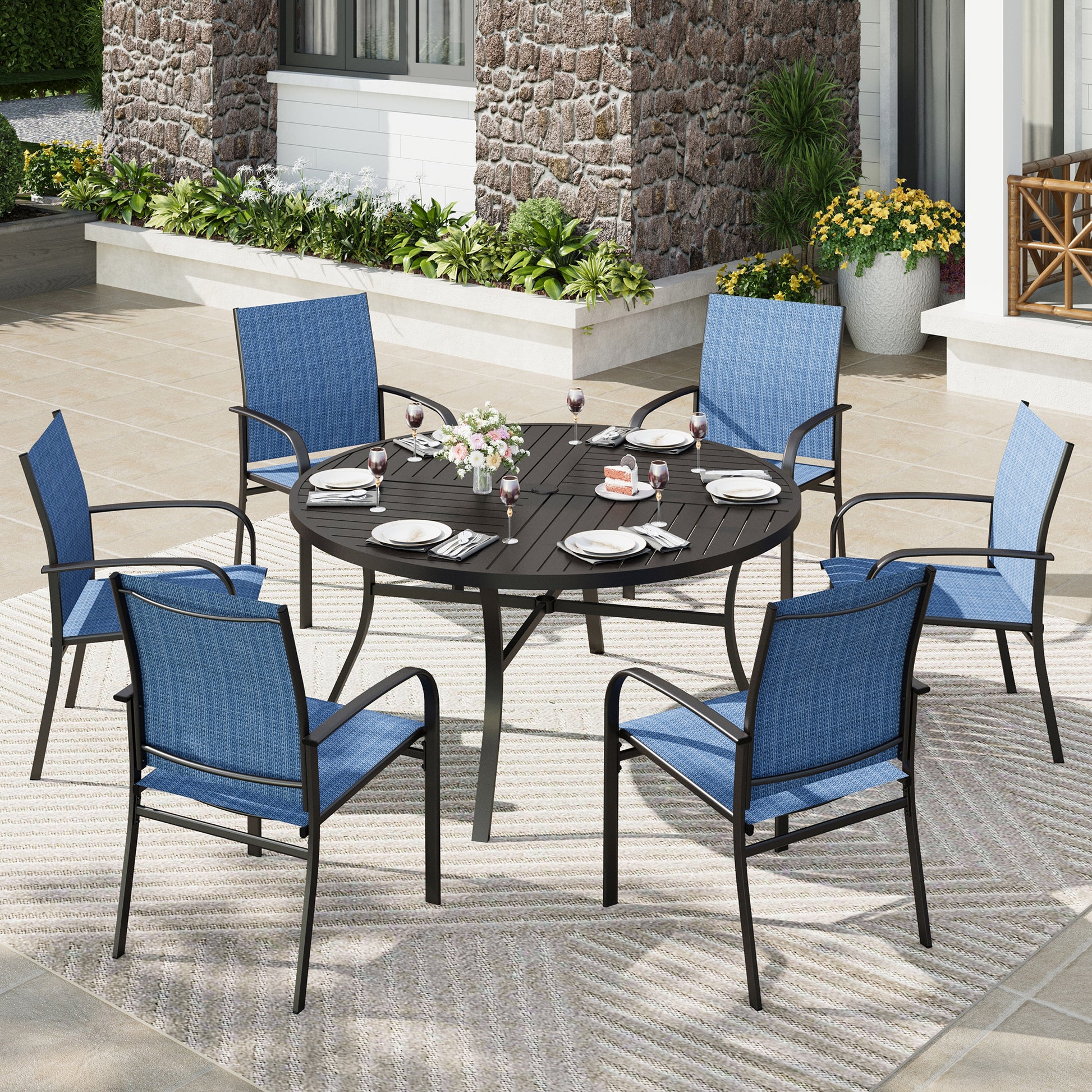 Captiva Designs 7pc Black Round Slatted Steel Table with Umbrella Hole & Textilene Chairs