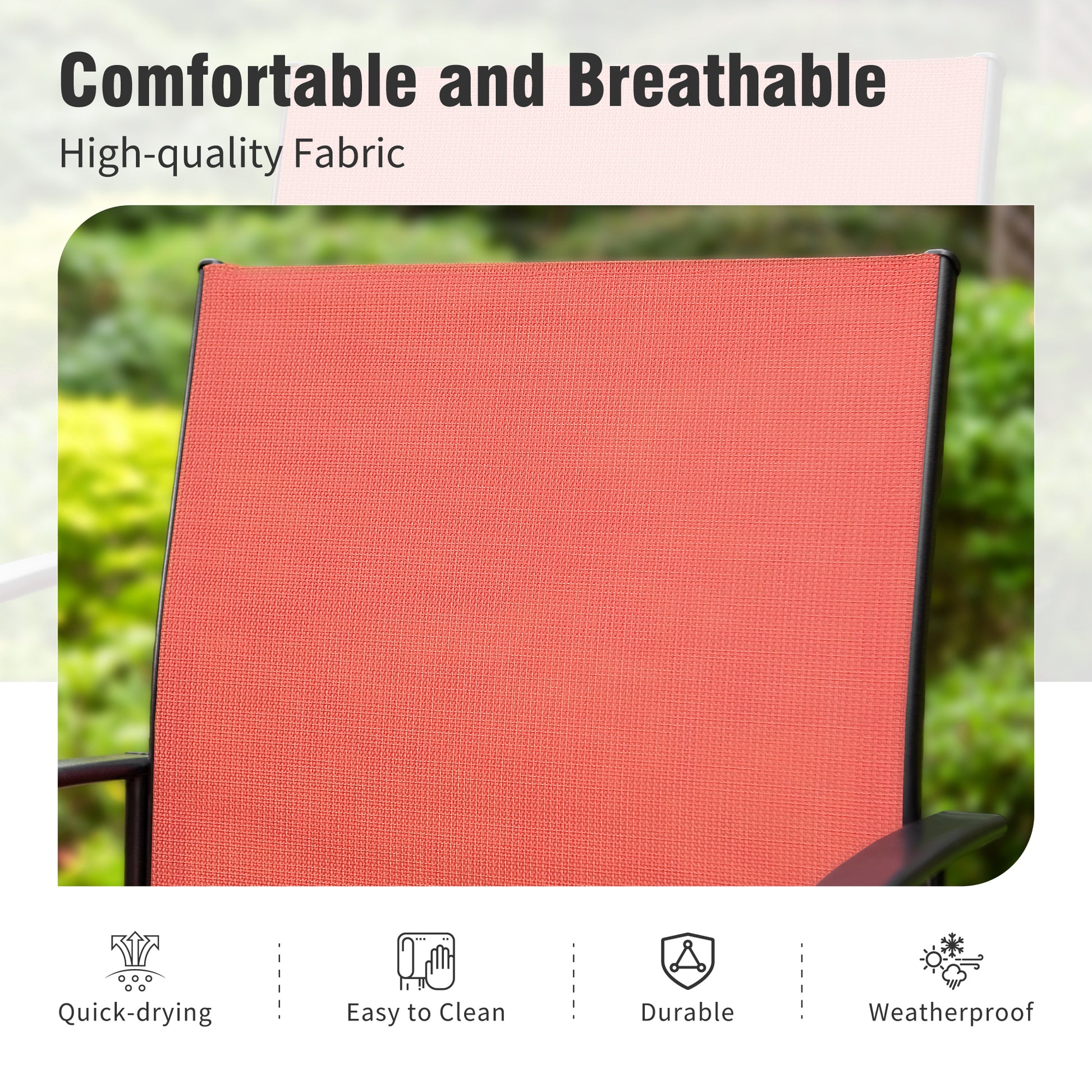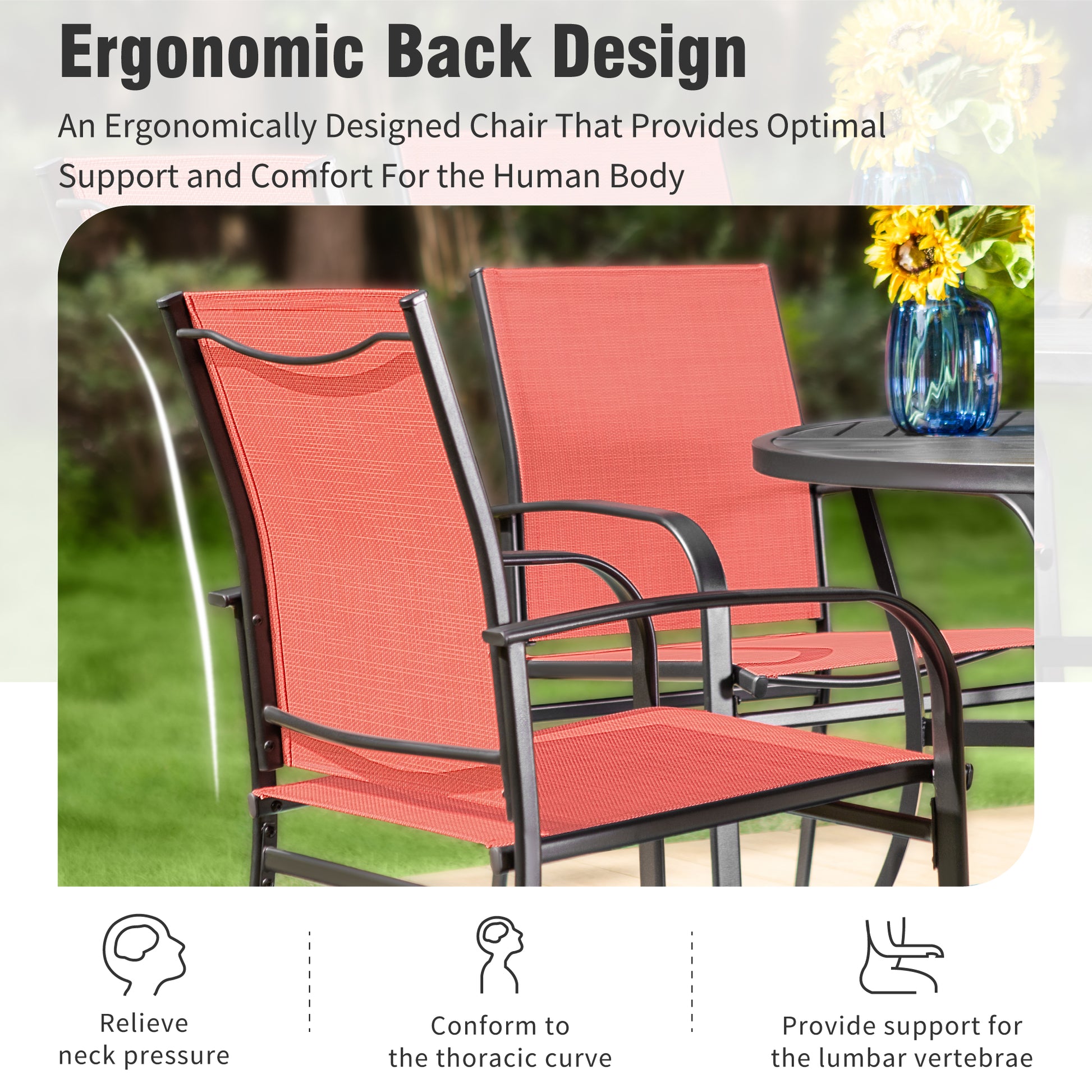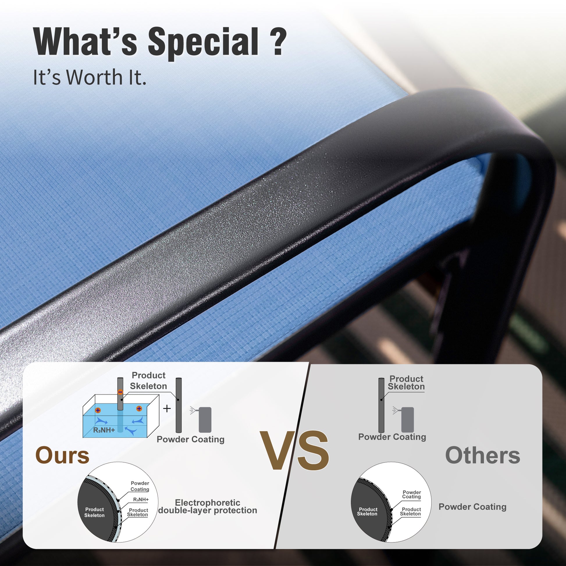 These ergonomic breathable sling patio chairs are expertly designed to combine comfort and style. With extra-wide seats, ergonomic backrests, and wide curved armrests, these chairs offer superior comfort for all-day relaxation. Built for all-weather use, the UV-resistant textilene fabric ensures durability and easy maintenance, while each chair supports up to 300 lbs. Crafted from durable E-coated and powder-coated steel with robust cross leg connectors, this set is designed to withstand outdoor conditions for lasting enjoyment.