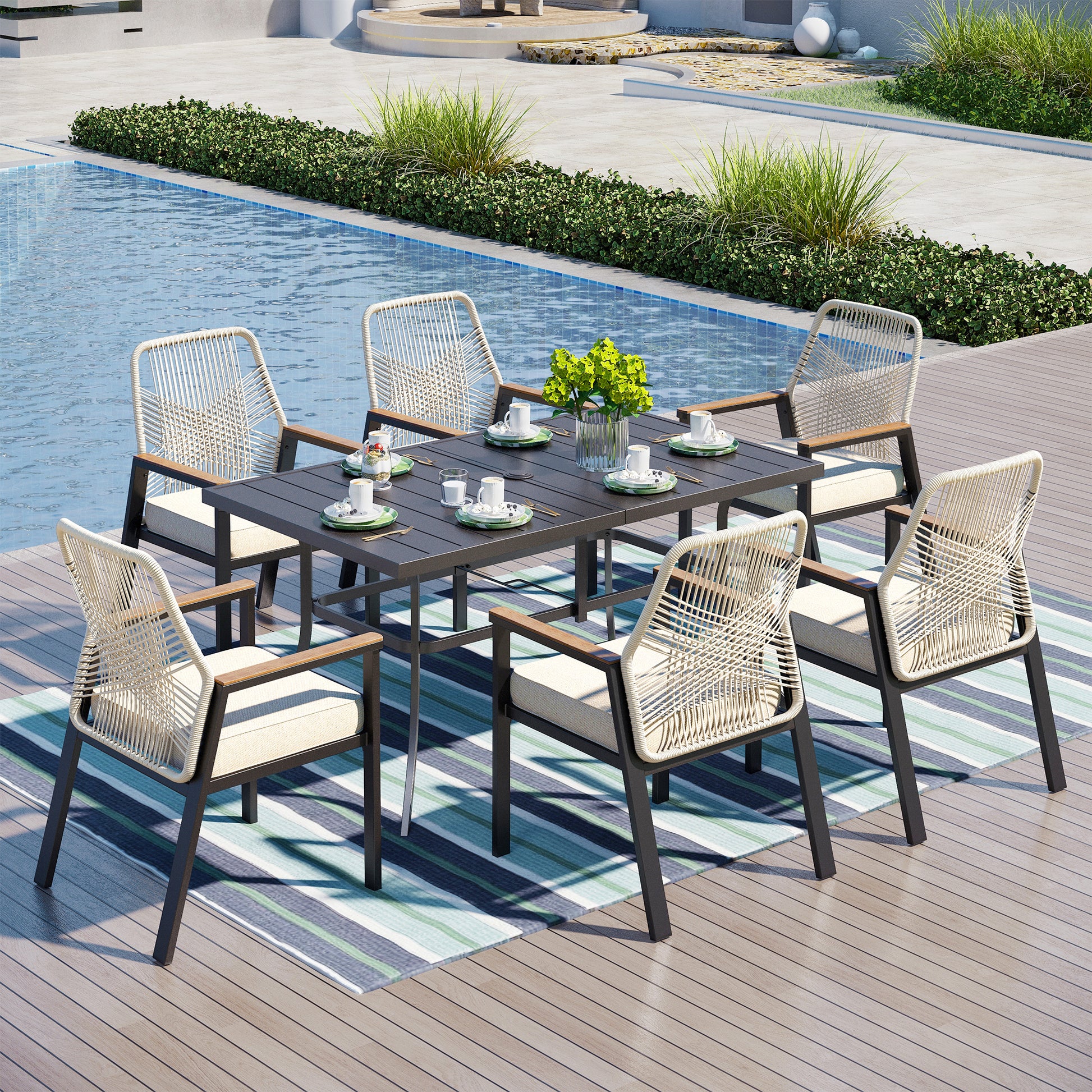 Captiva Designs 7pc Outdoor Dining Rectangular Slat-top Steel Table with Umbrella Hole & Beige Rattan Fixed Chairs