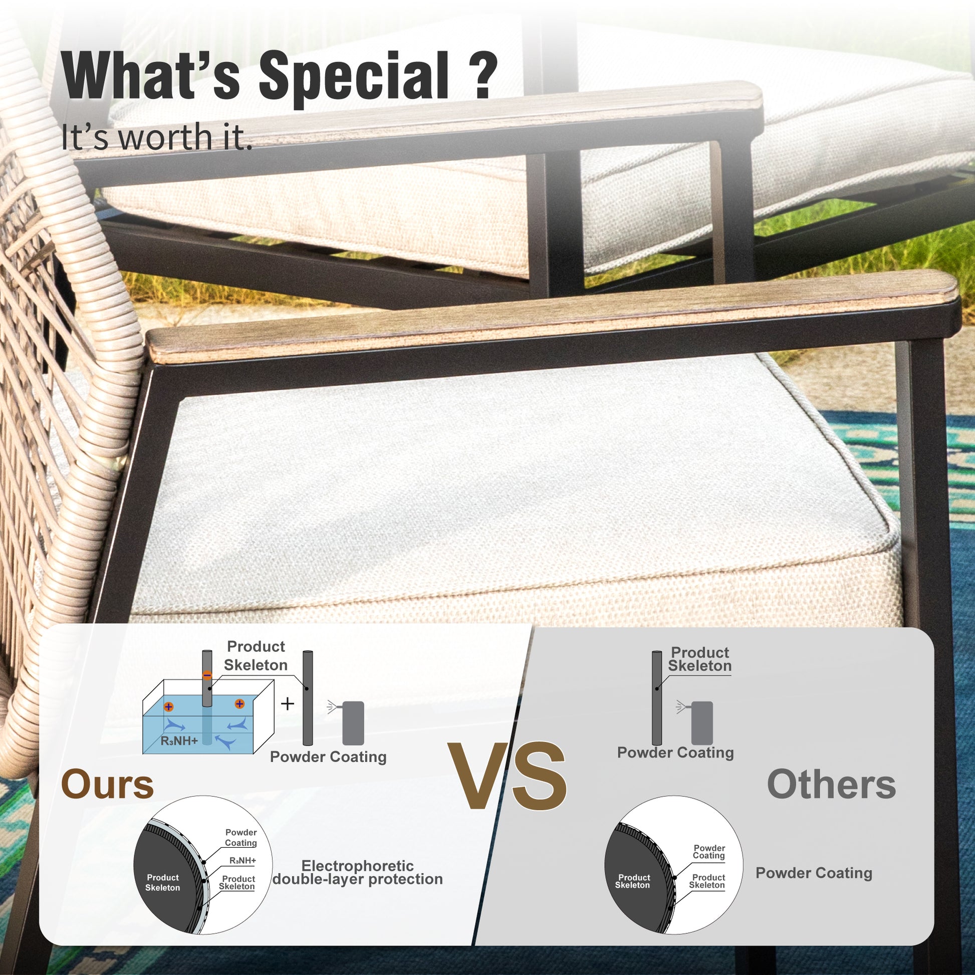 Enhance your outdoor living space with the Captiva Designs 7pc Outdoor Dining set. Featuring a sturdy rectangular steel table equipped with a convenient umbrella hole, this set invites comfortable dining and shade customization. Enjoy durable beige rattan fixed chairs designed for stability and classic style. Host gatherings effortlessly, create a stylish patio ambiance, and experience lasting comfort with weather-resistant materials built to withstand outdoor conditions. Elevate your alfresco dining with this expertly crafted, functional ensemble.