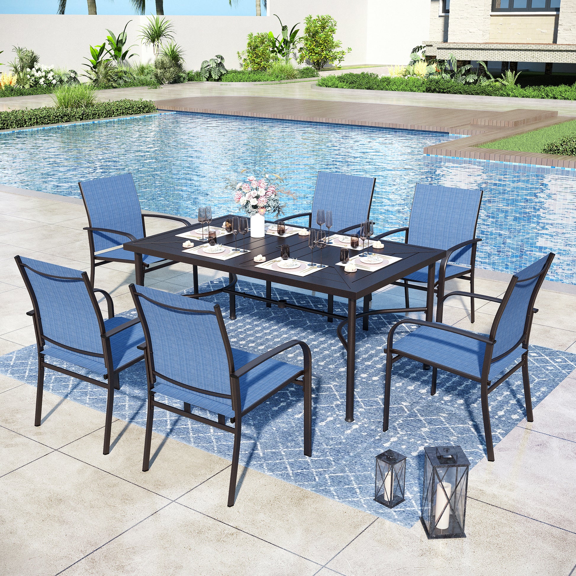 Captiva Designs 7pc Outdoor Patio Geometric Pattern Rectangular Steel Dining Table & Sling Fixed Chairs