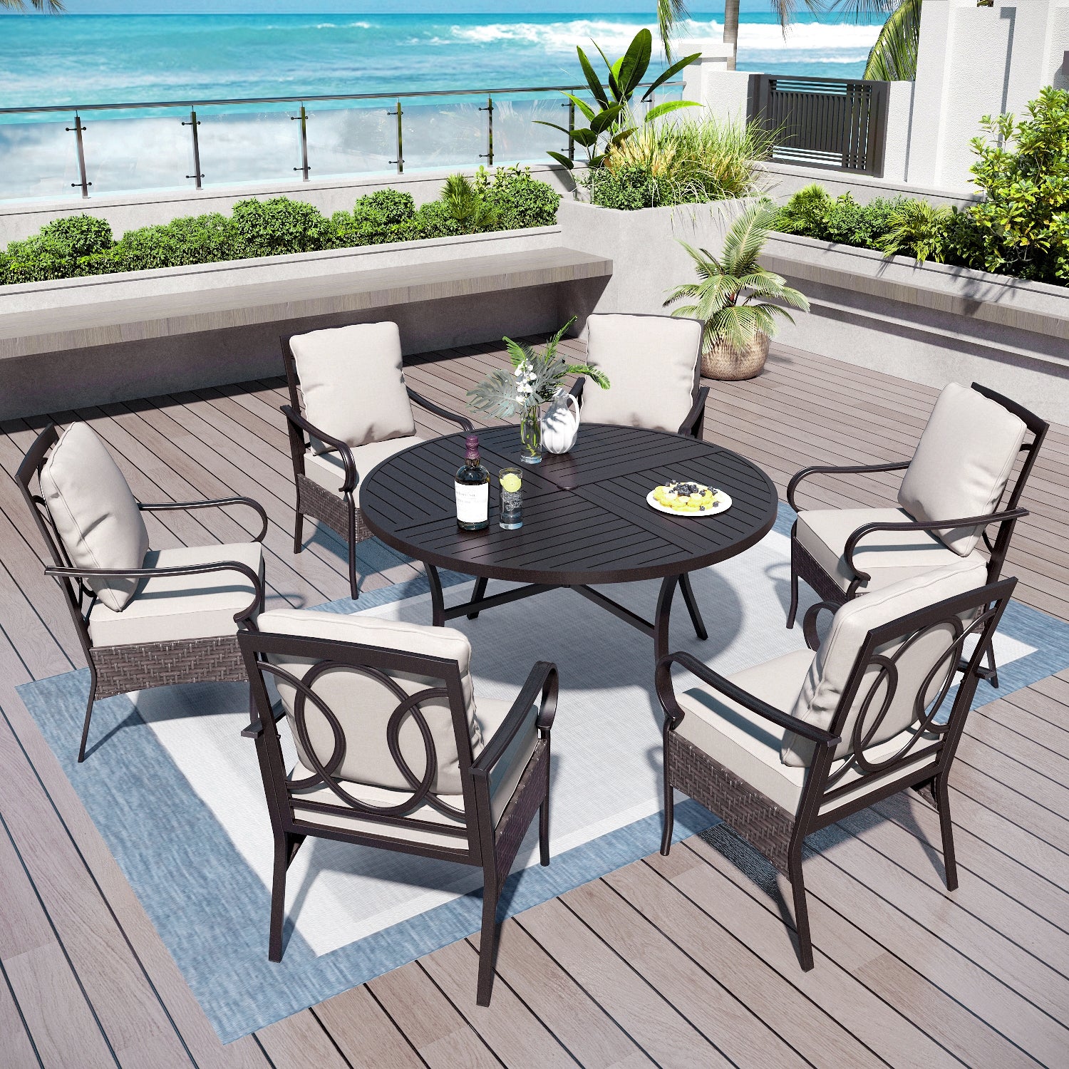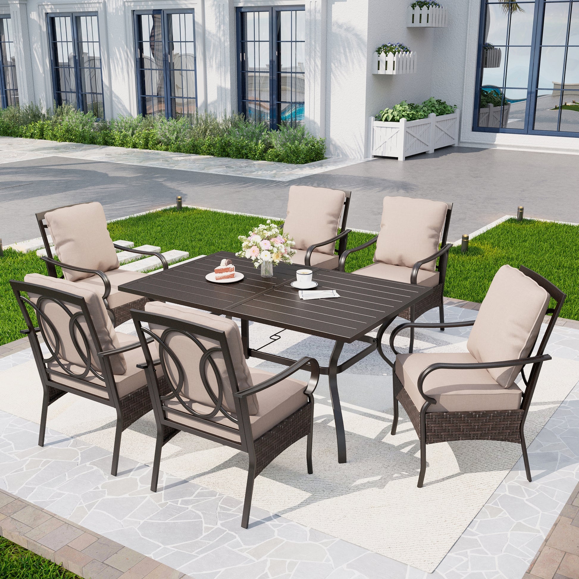 Captiva Designs 7pc Patio Dining Set with Slat-top Steel Table & Rattan Metal Chairs with Removable Cushions