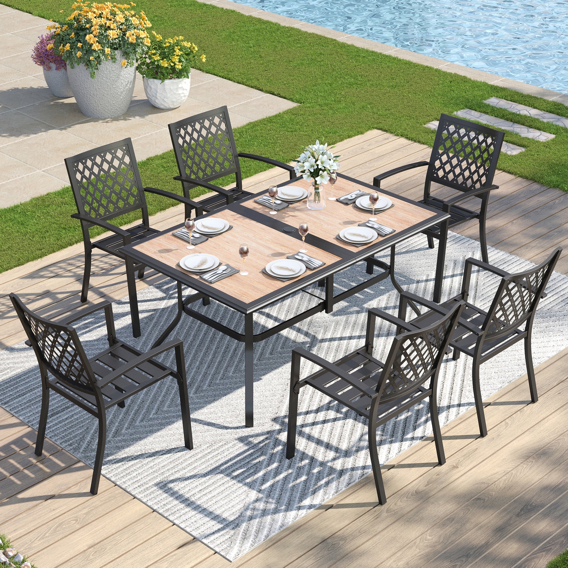 Captiva Designs 7pc Patio Dining Set with Wood-look Rectangle Steel Table & Stylish Back Metal Chairs