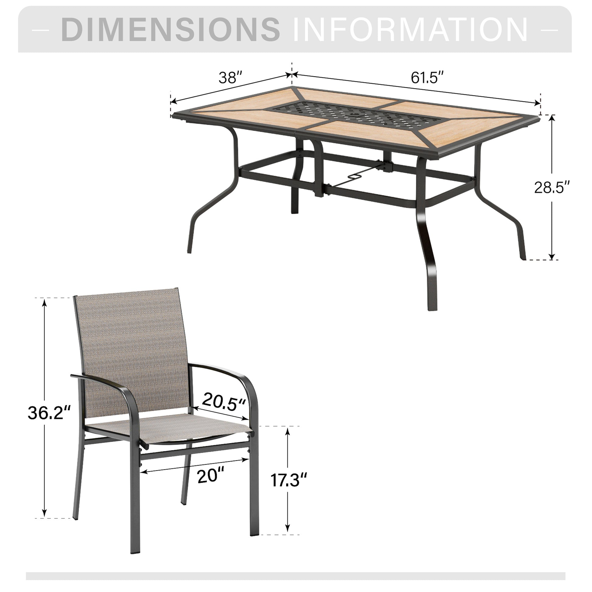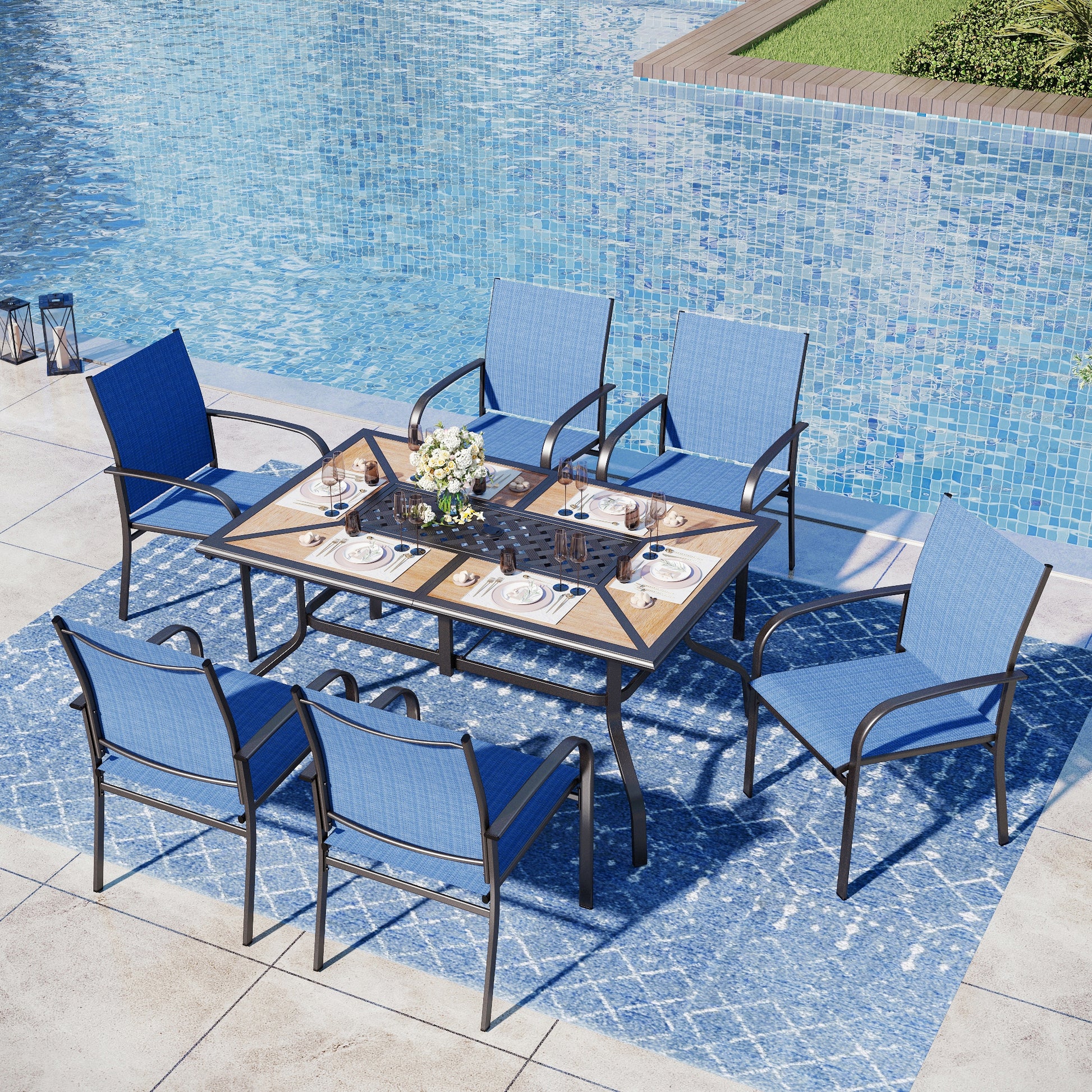 [<b>CAPTIVA DESIGNS</b>] Upgrade your outdoor dining with our 7pc Patio Dining Set. The black steel table seats 6, and the wood-like top adds indoor and outdoor elegance.