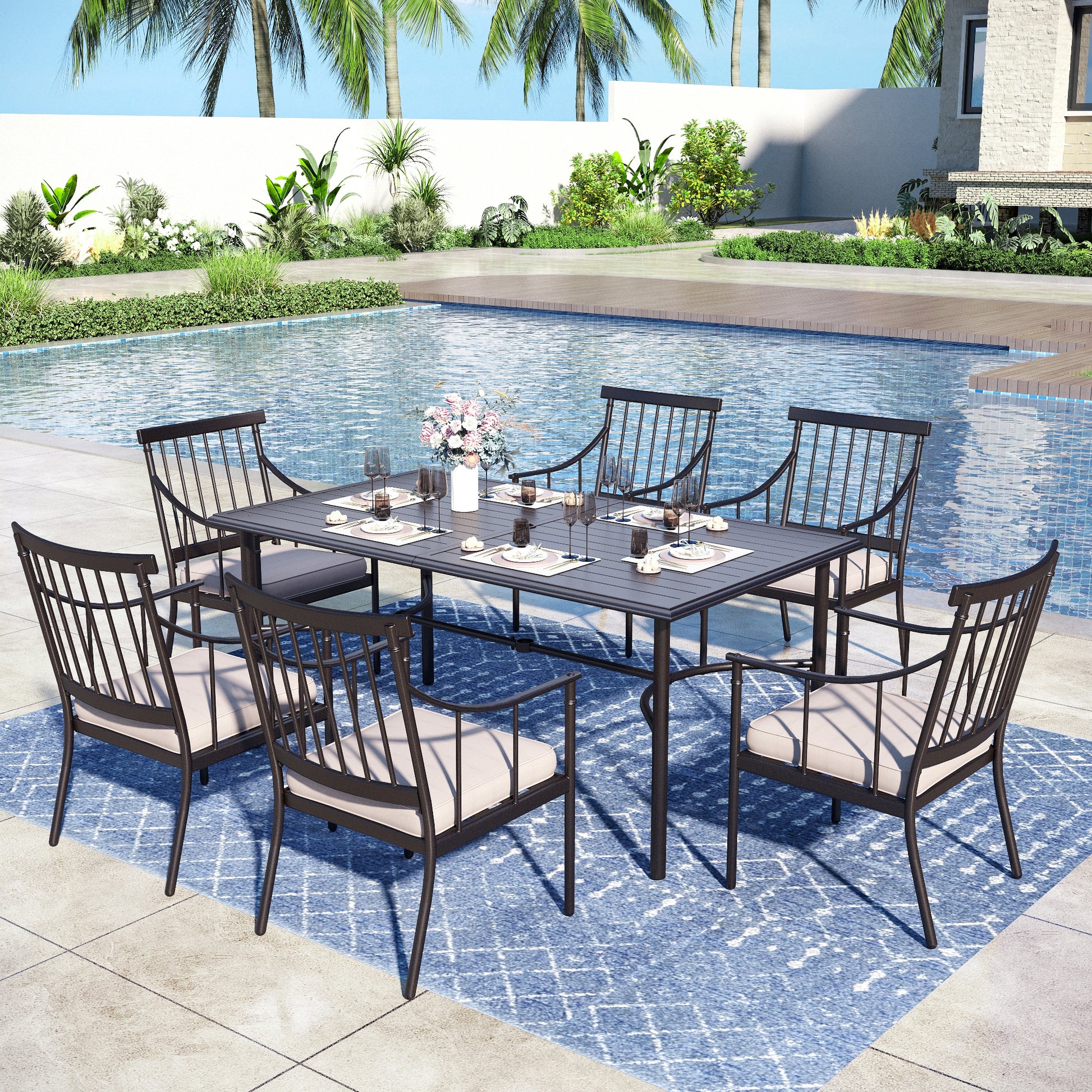 Enhance your outdoor dining experience with the Captiva Designs 7pc Patio Set. Featuring a durable steel dining table with a slatted top and built-in umbrella hole, it allows easy installation of your favorite umbrella for shade. Designed with stylish cushioned metal chairs, it provides comfortable seating and long-lasting support. Perfectly balance style and function while entertaining guests or enjoying family meals outdoors. Upgrade your patio setup with this elegant and practical dining collection built to withstand the elements.