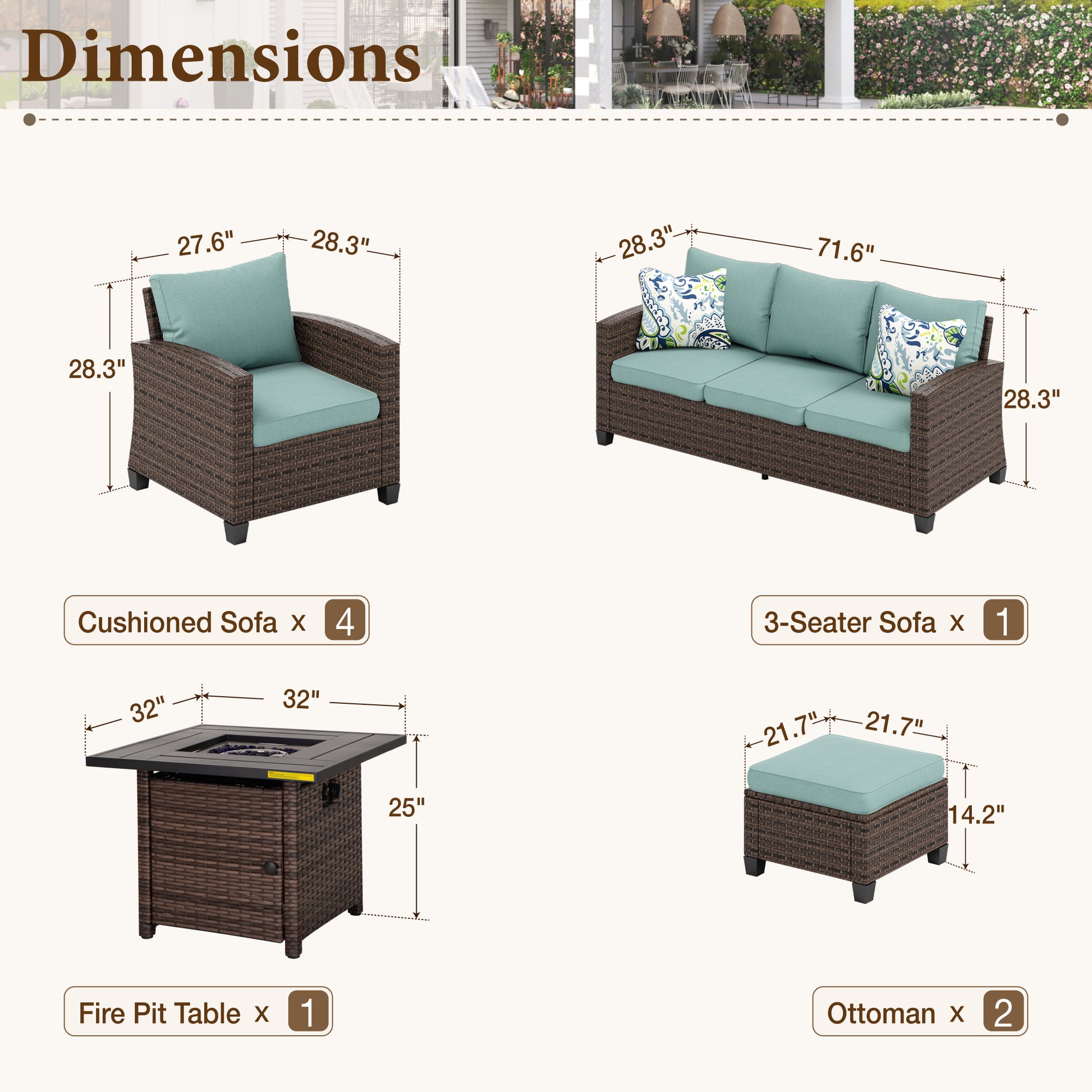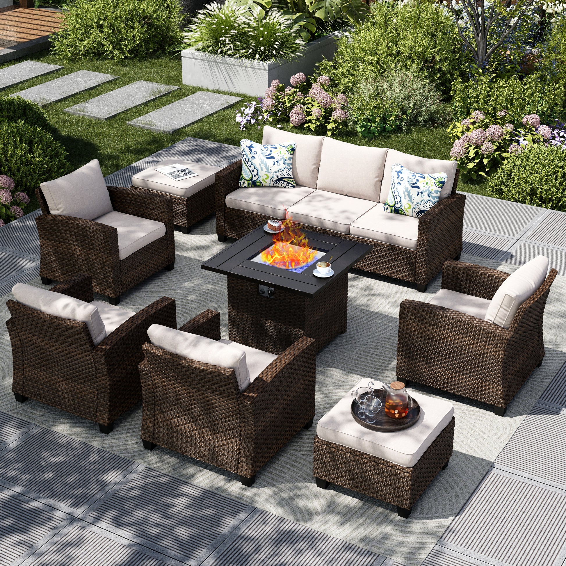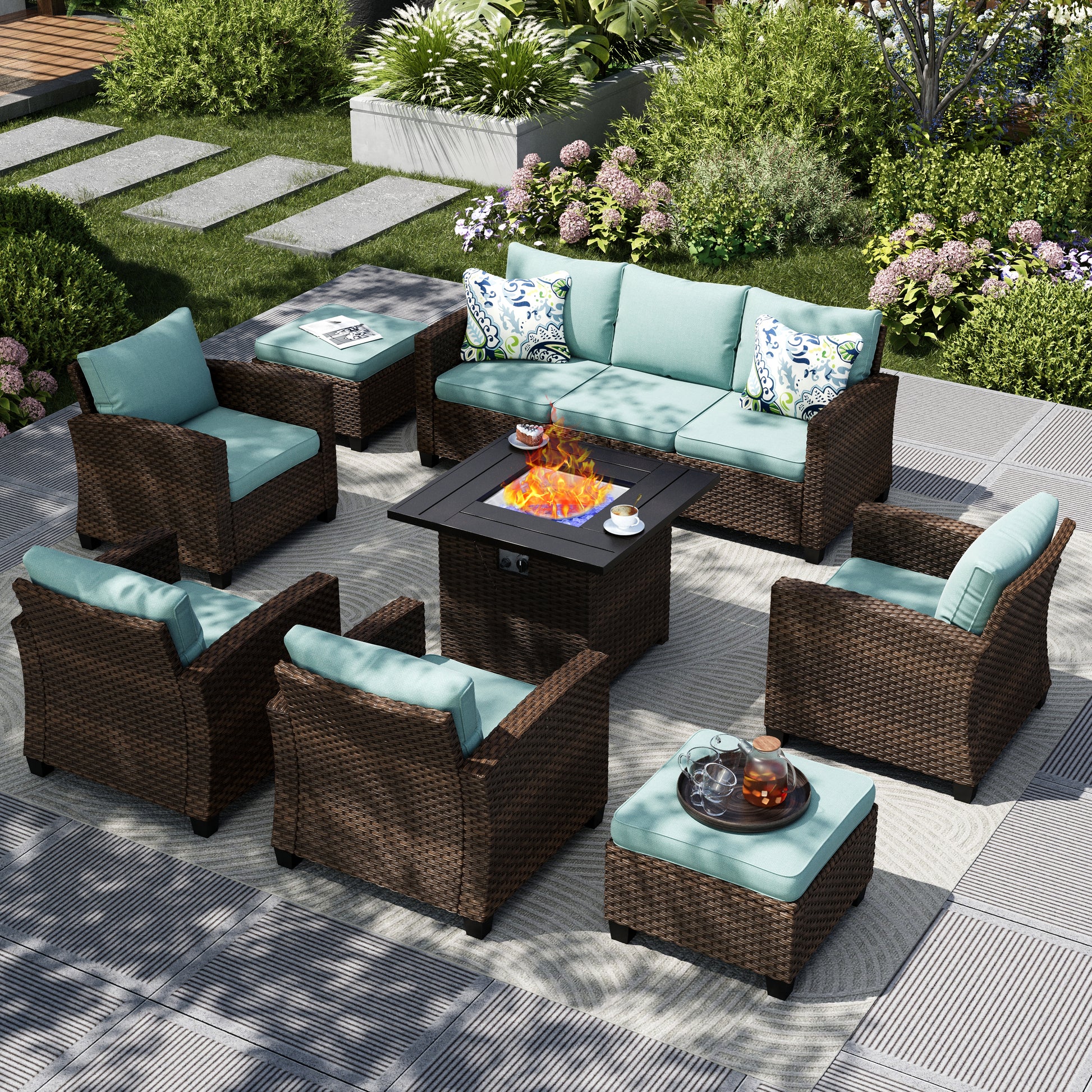 Captiva Designs 8pc Outdoor Patio Wicker Rattan Cushioned Fire Pit Set with Ottomans and Single Sofas