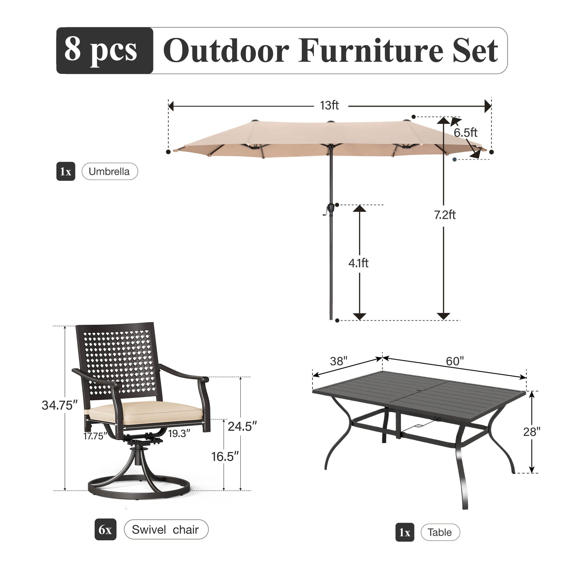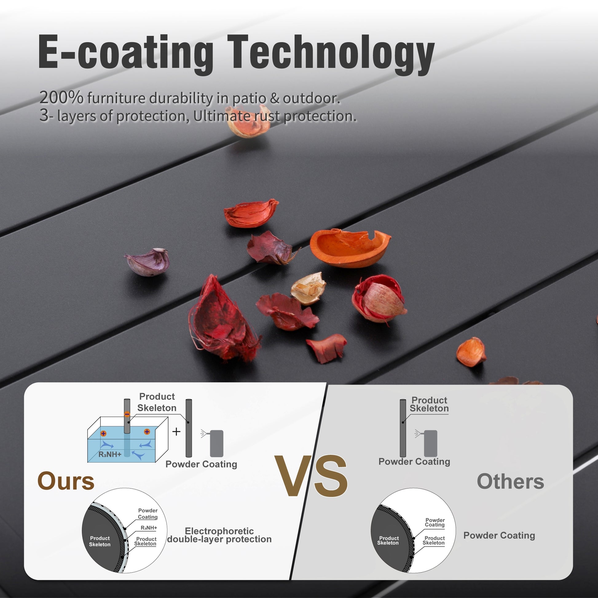 Elevate your outdoor dining experience with our 8-Piece Outdoor Dining Set, featuring a spacious Steel Rectangle Dining Table that comfortably seats 6 guests. This stylish table includes a 1.57" umbrella hole and a slat tabletop for easy cleaning, all crafted from durable E-coated and powder-coated black steel. The elegant angled legs provide ample legroom, while the chic grooved edges enhance its modern design.