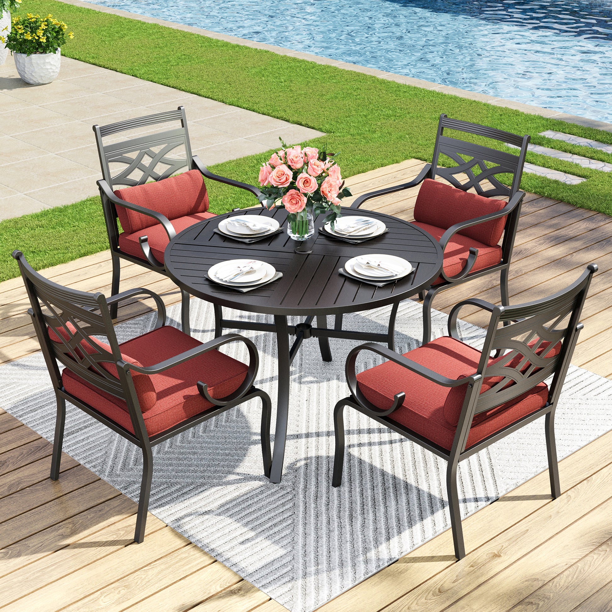 Captiva Designs 5pc Outdoor Slat-top Dining Table with Umbrella Hole and Metal Chairs with Seat Cushion & Waist Pillow