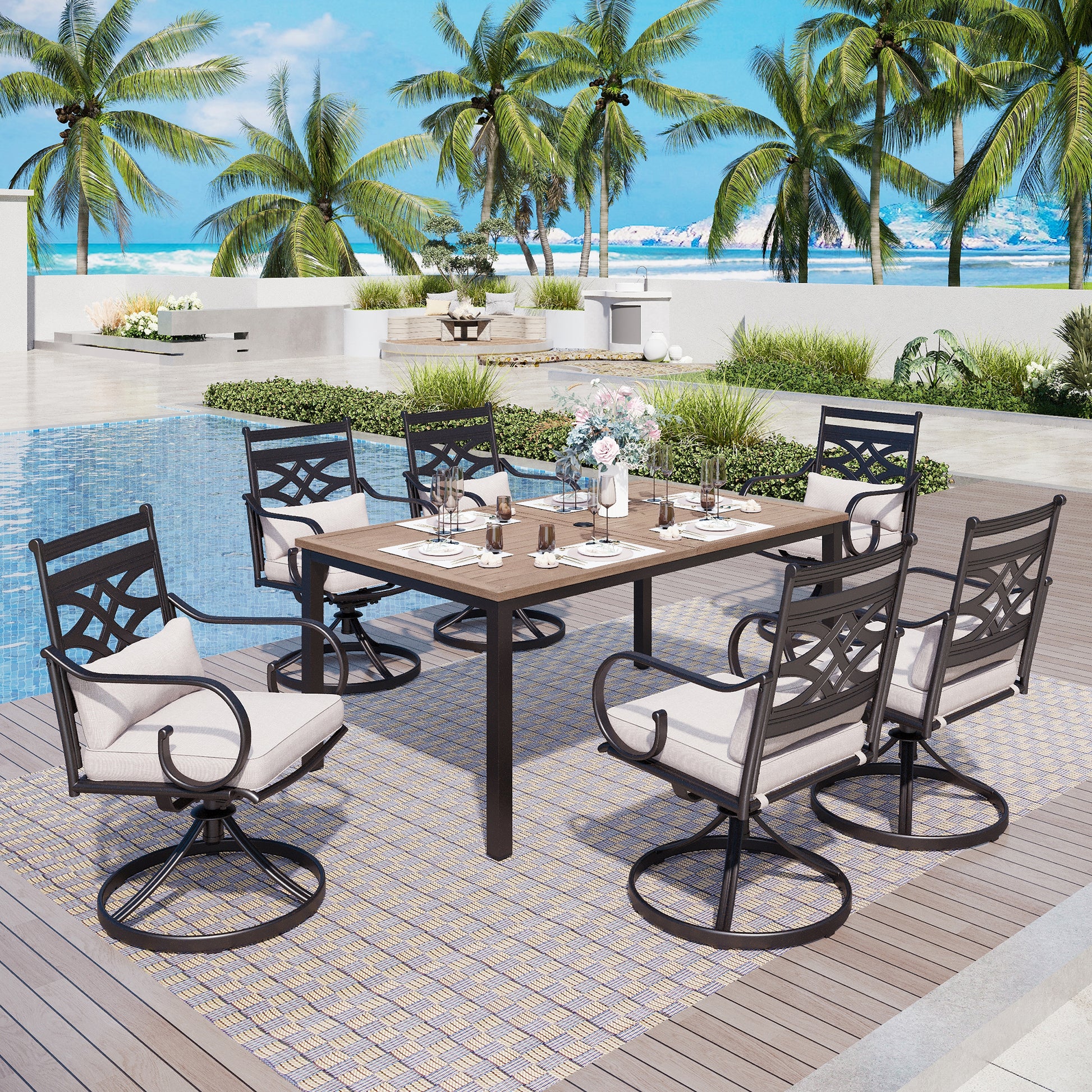 Elevate your outdoor dining experience with the Captiva Designs 7-piece patio set, featuring a durable steel rectangular table with a slatted top for easy drainage and airflow. The set includes swivel chairs equipped with comfortable seat cushions and supportive waist pillows, combining ergonomic design with weather-resistant materials. Ideal for both casual meals and entertaining, this collection offers lasting style and functionality for your patio space.