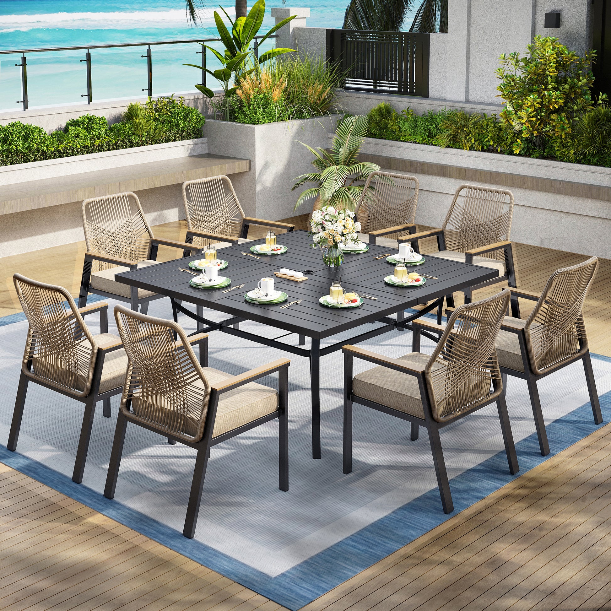 Captiva Designs 9pc Patio Dining Set with Spacious Slat-top Square Metal Table & Beige Rattan Chairs