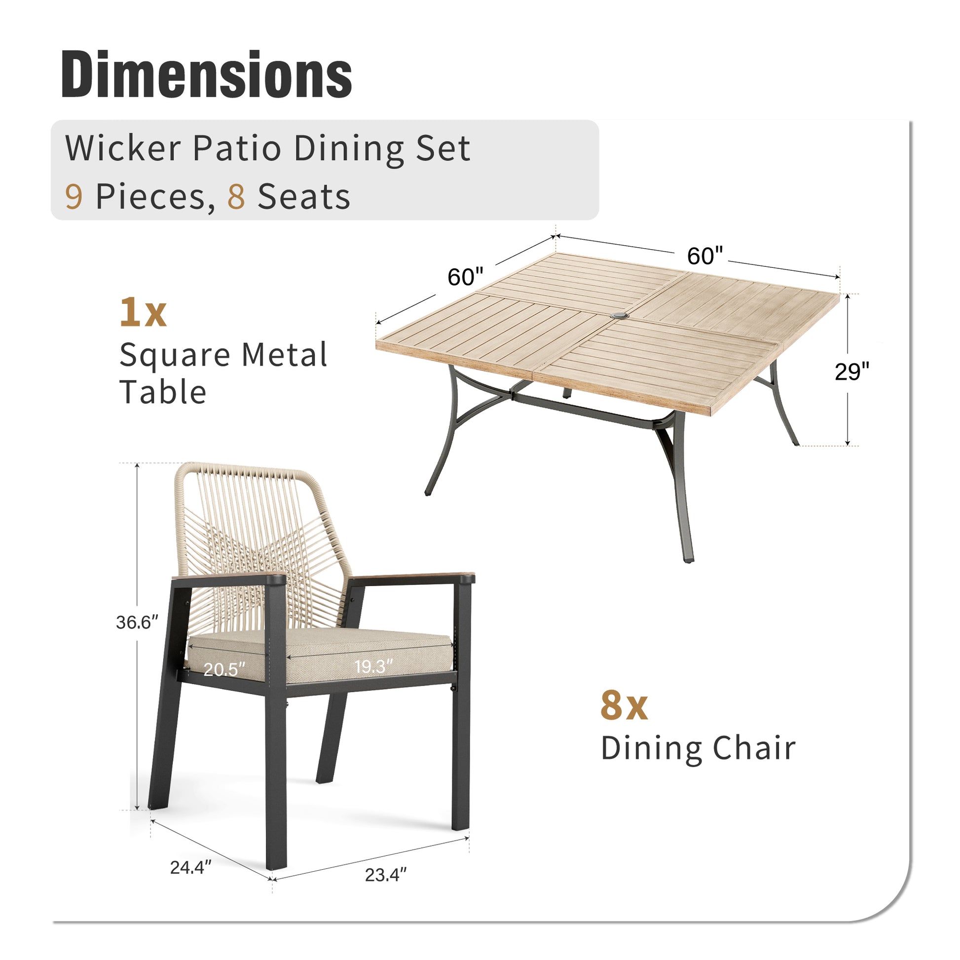 [<b>CAPTIVA DESIGNS</b>] Enhance your outdoor dining with our 9pc Patio Dining Set. The spacious 60 inches x 60 inches square metal table features a slatted top that prevents water accumulation for easy maintenance. Equipped with a 1.57 inches pre-cut umbrella hole for UV protection, this table combines functionality and style.