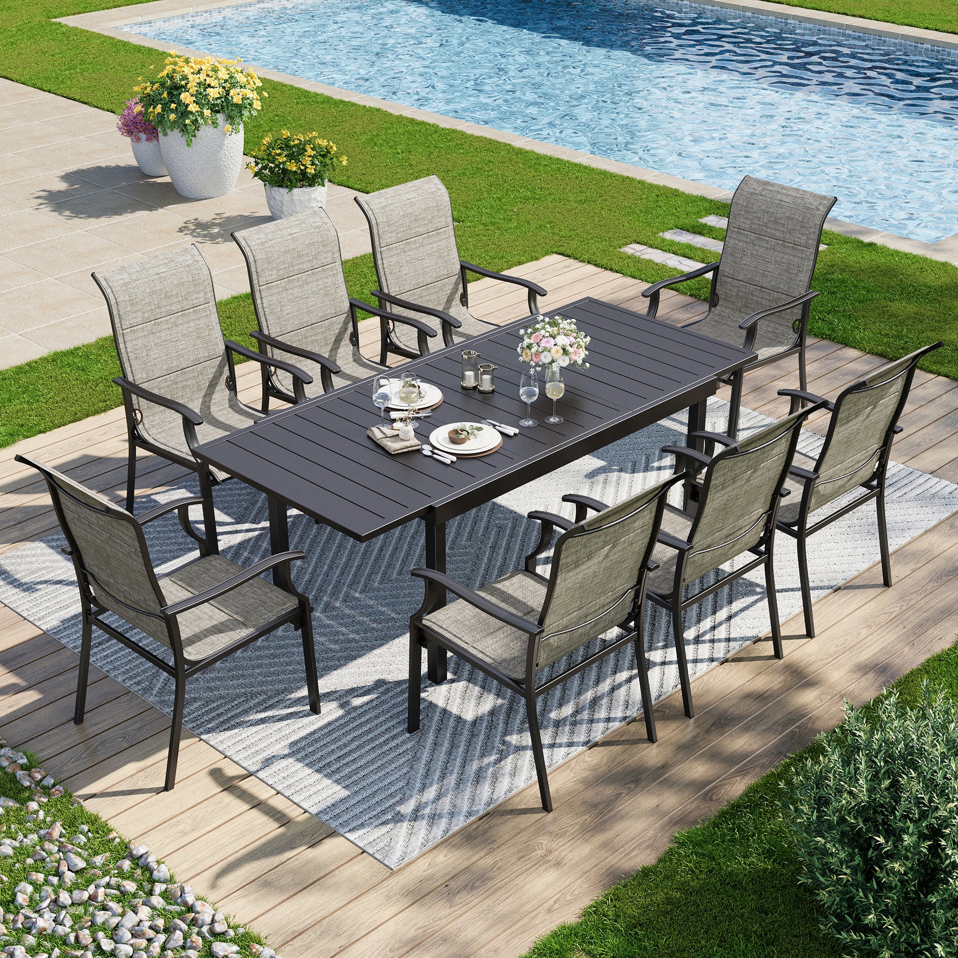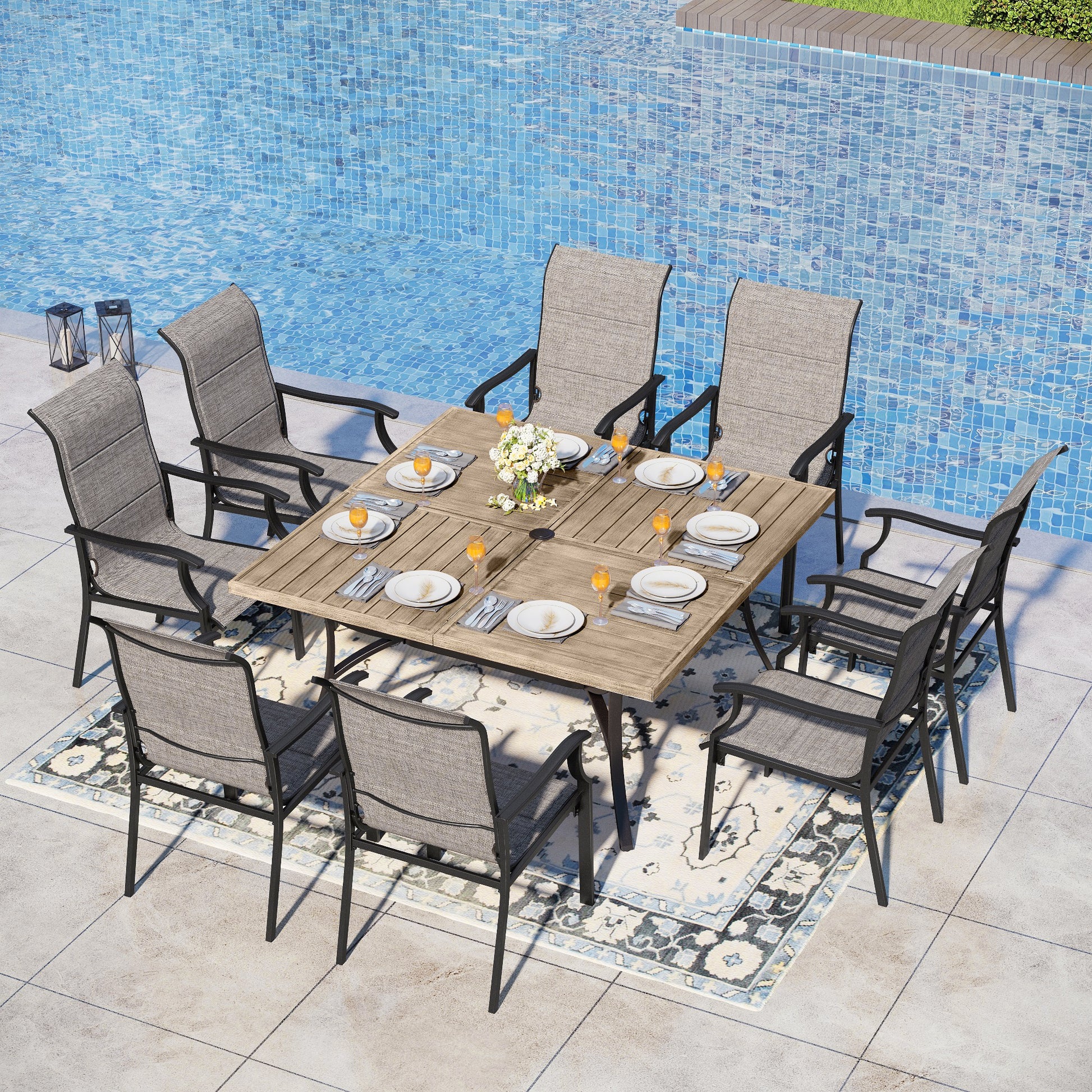 Captiva Designs 9pc Patio Spacious Black Steel Dining Table & High Back Padded Grayish Brown Sling Armrest Chairs