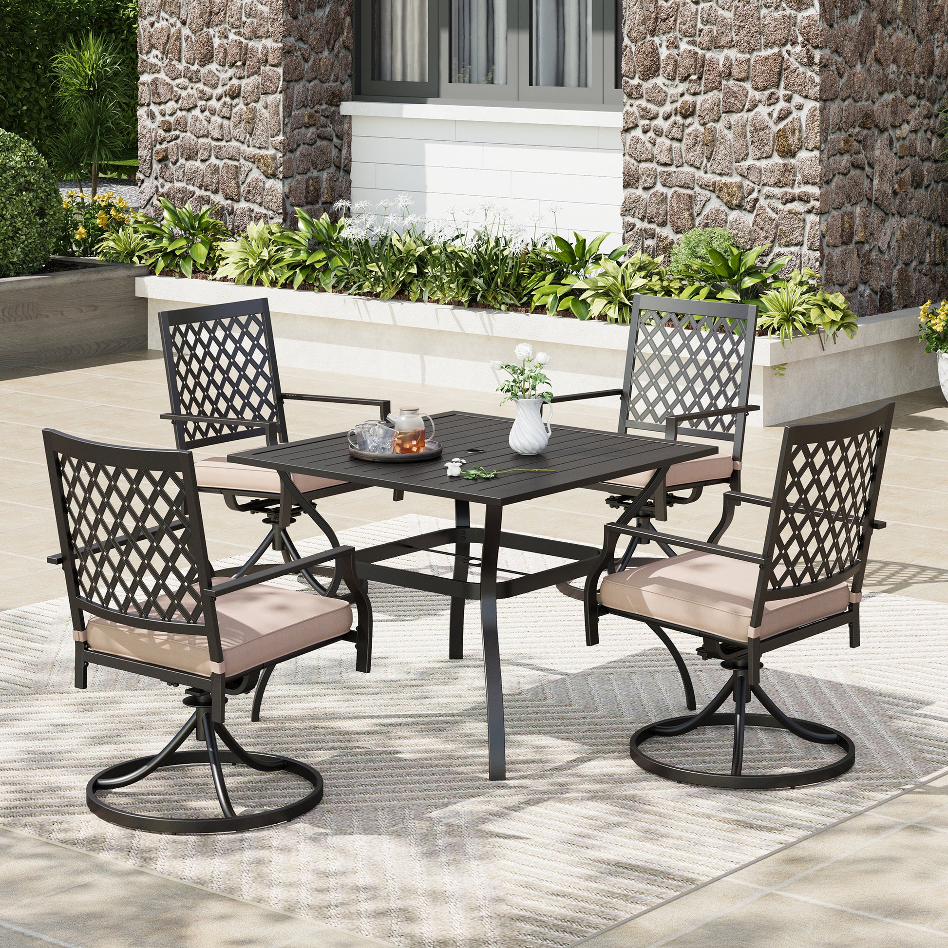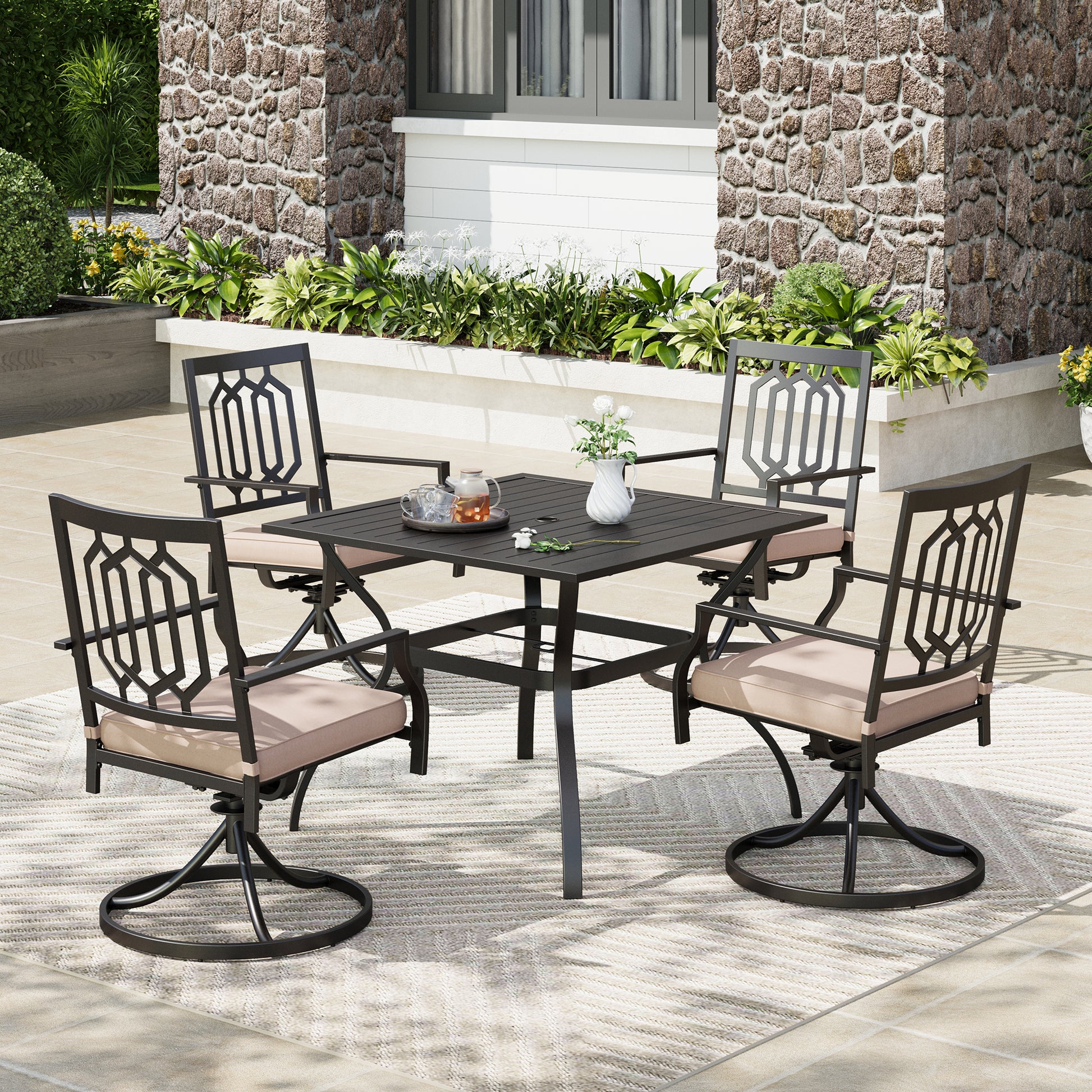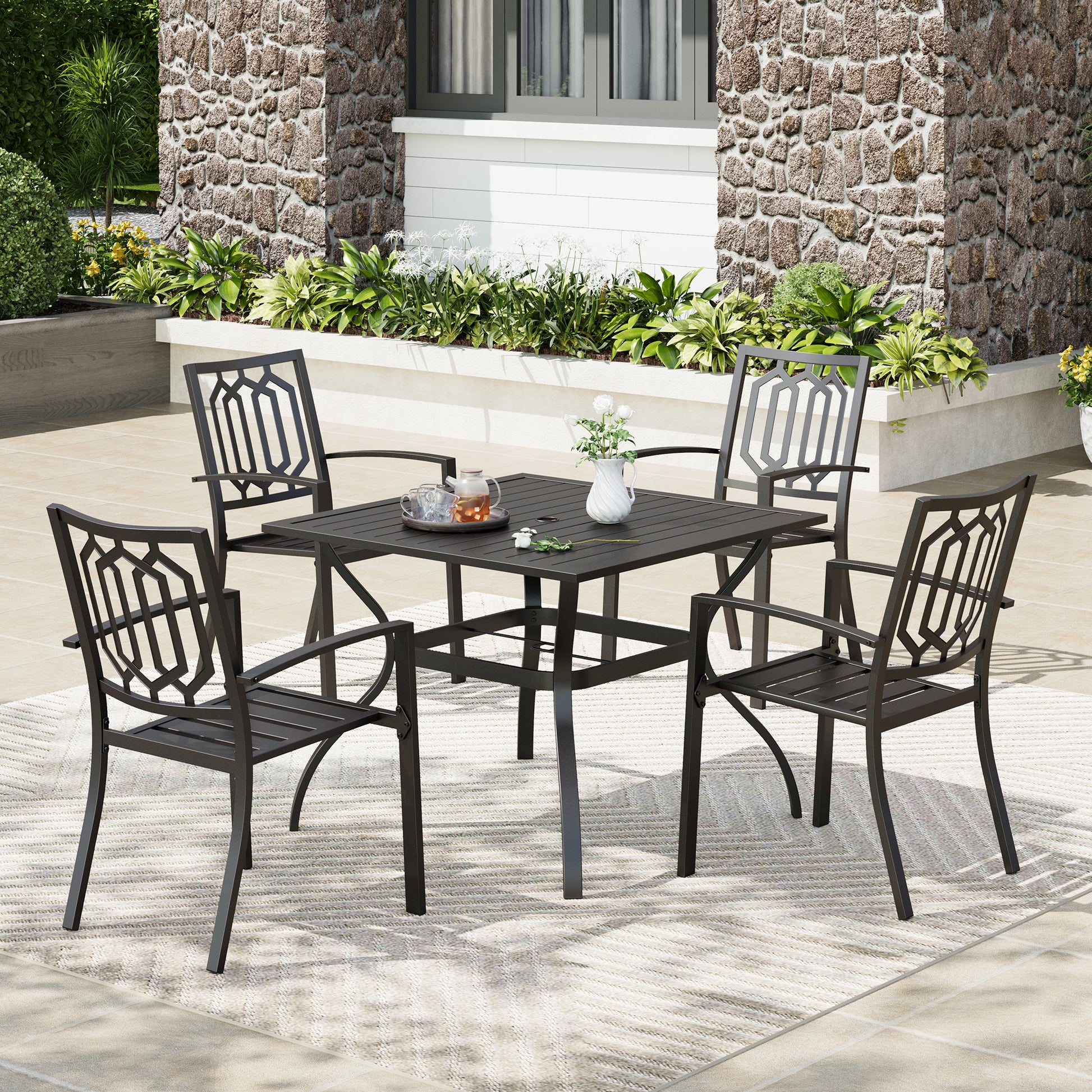 Captiva Designs 5pc Patio Slat-top Square Steel Dining Table with Umbrella Hole & Metal Arm Chairs