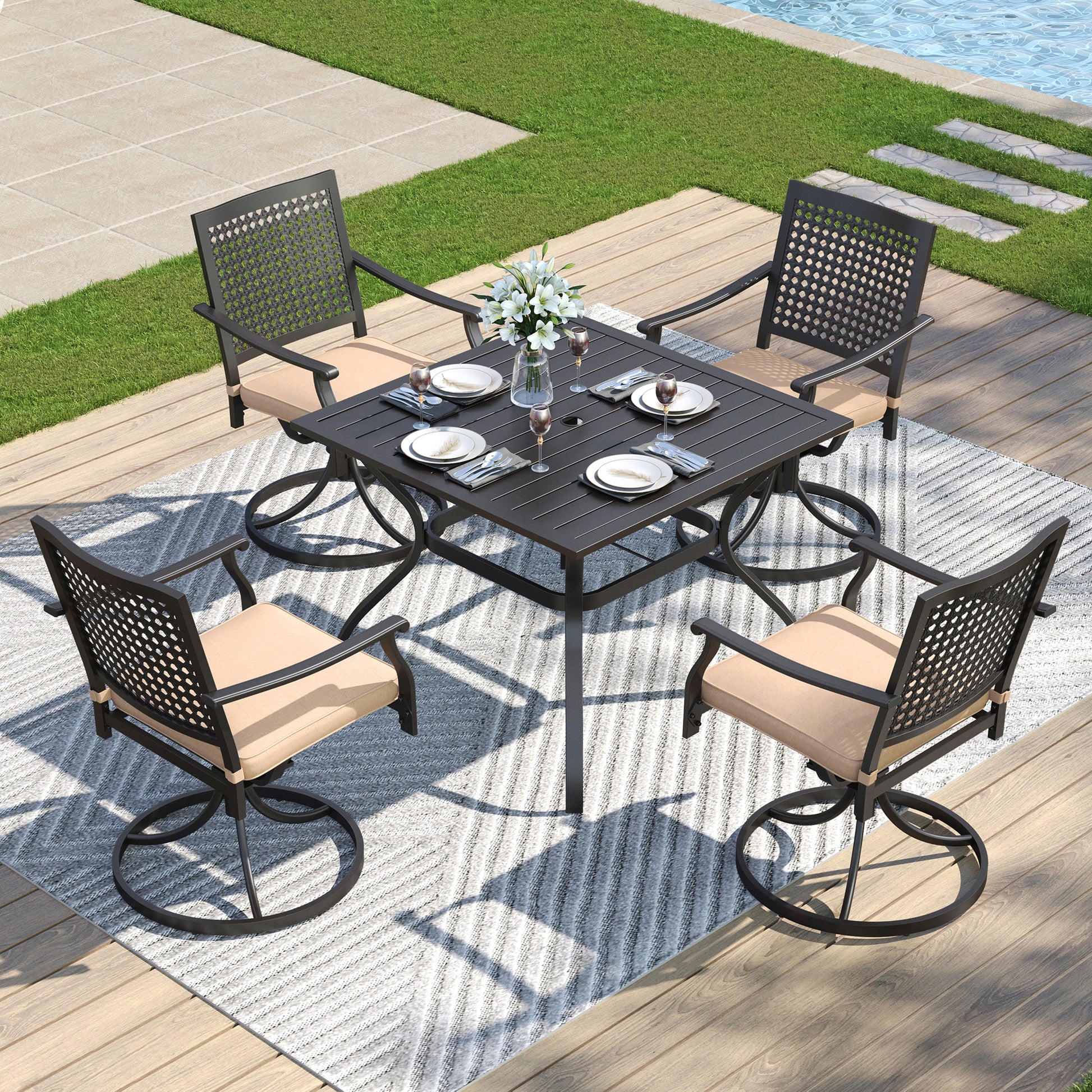 The Captiva Designs 5-piece patio set features a square steel dining table with a slat-top design and a convenient umbrella hole, perfect for outdoor shading. Accompanied by four sturdy metal armchairs, this set combines durability with comfort, making it ideal for alfresco dining and gatherings. Its steel construction ensures long-lasting use and resistance to outdoor elements, while the sleek design adds a modern touch to any patio space.