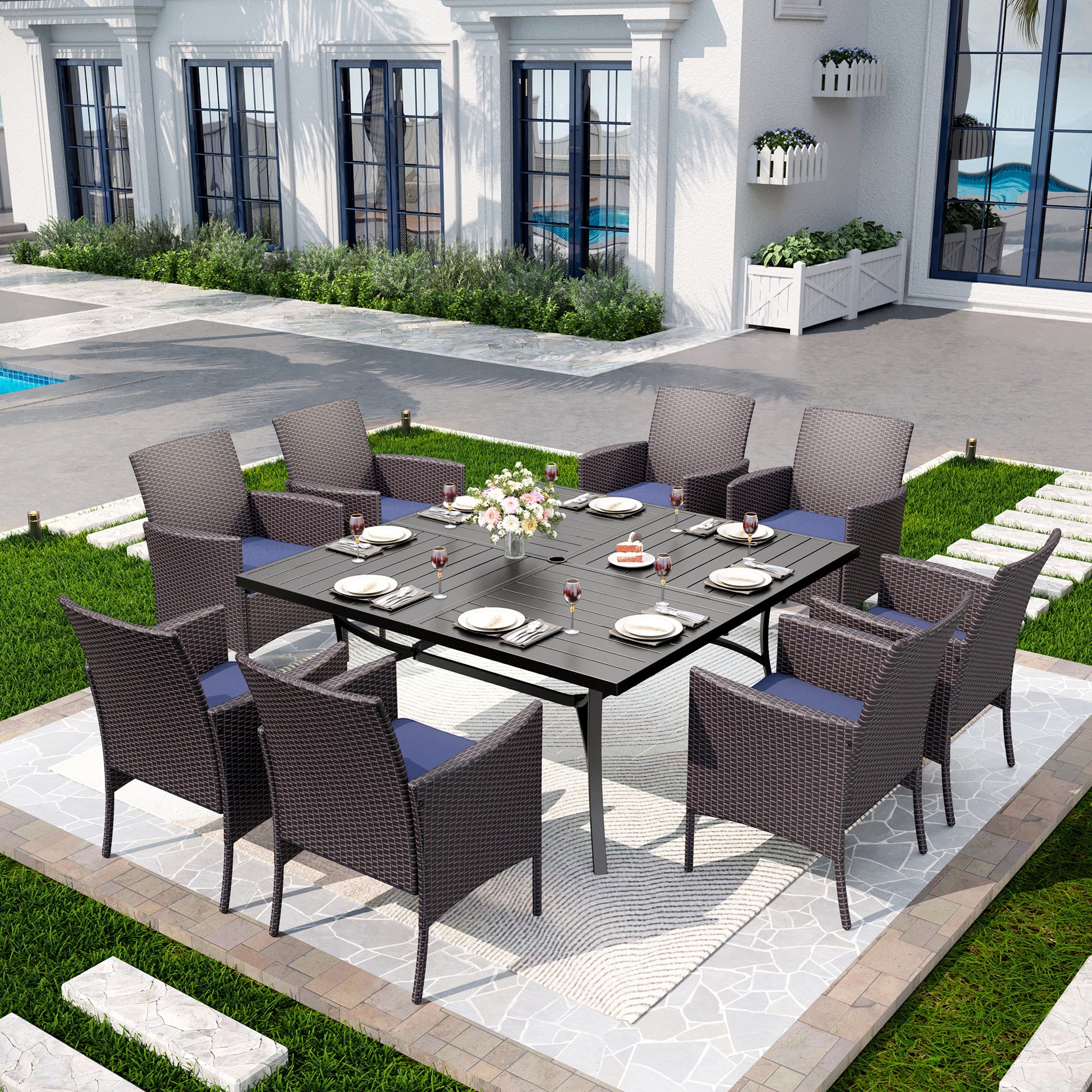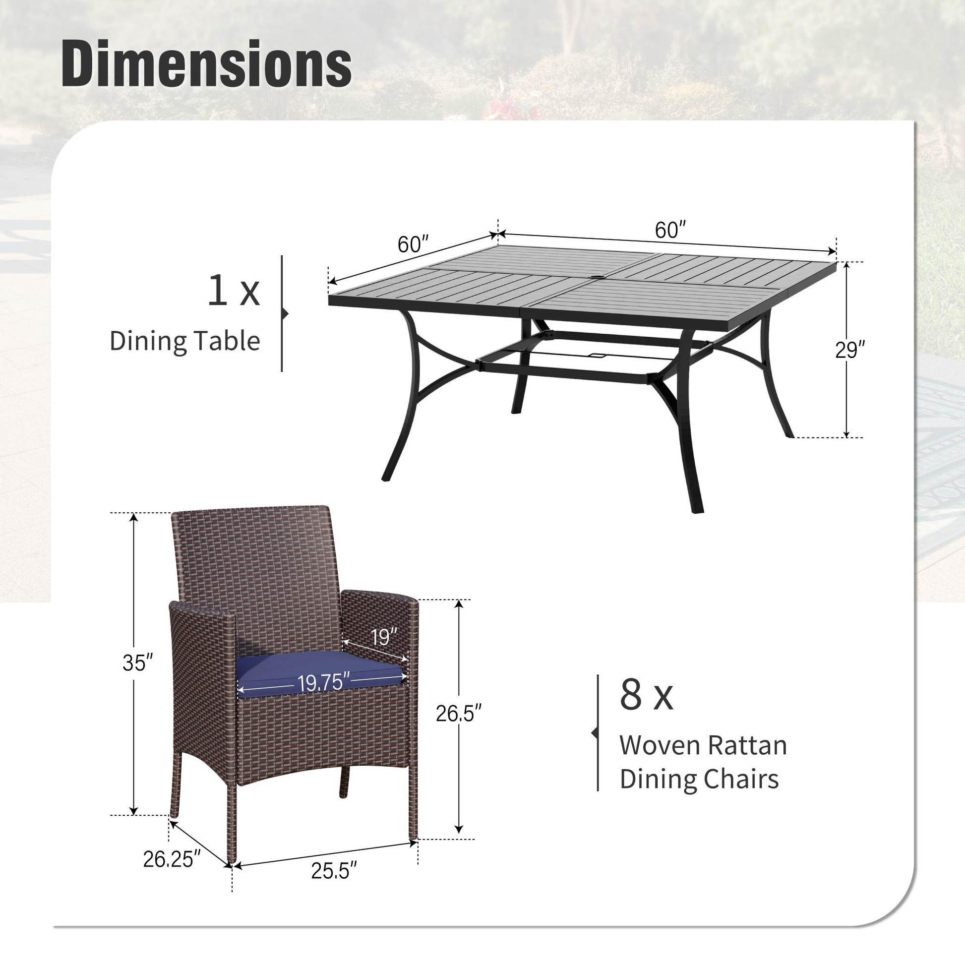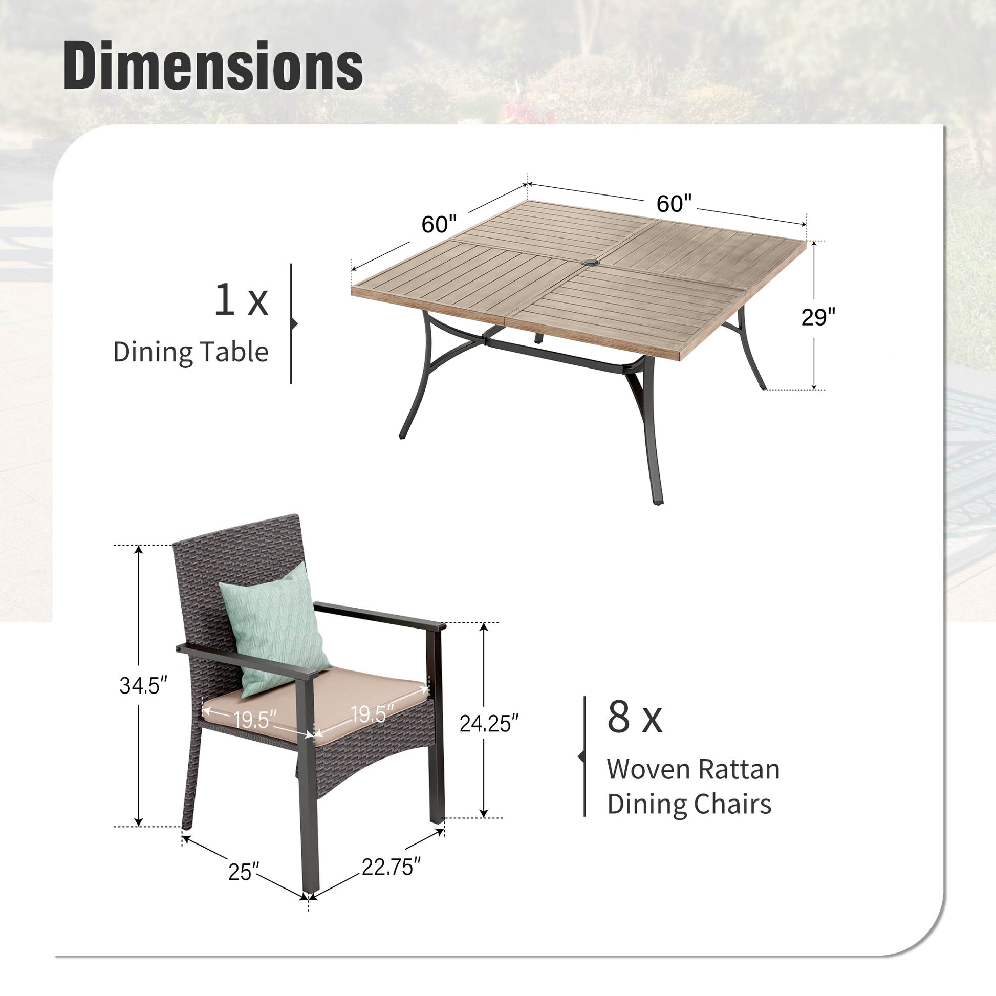 [<b>CAPTIVA DESIGNS</b>] Enhance your outdoor dining with our 9pc Patio Dining Set. The spacious 60 inches x 60 inches square metal table features a slatted top that prevents water accumulation for easy maintenance. Equipped with a 1.57 inches pre-cut umbrella hole for UV protection, this table combines functionality and style.