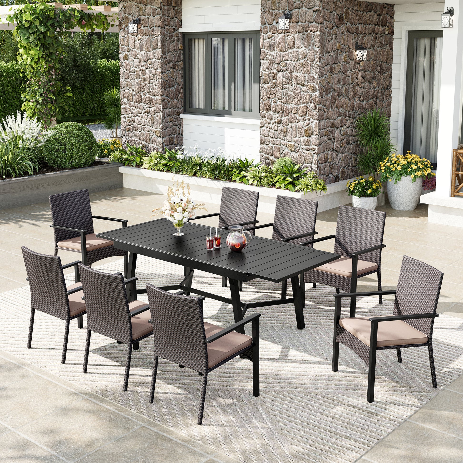 Captiva Designs 9pc Patio Rectangle Expandable Metal Dining Table & Rattan Chairs with Removable Cushions