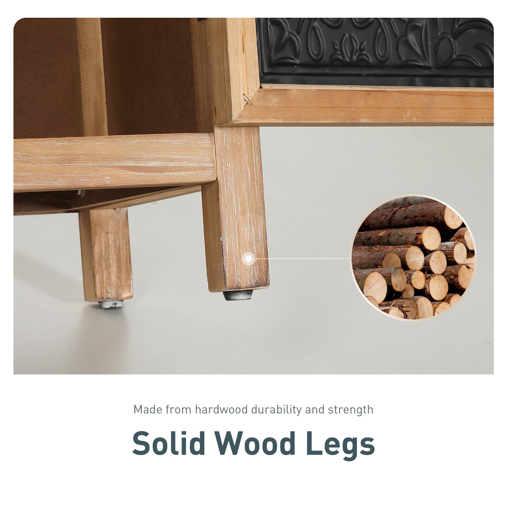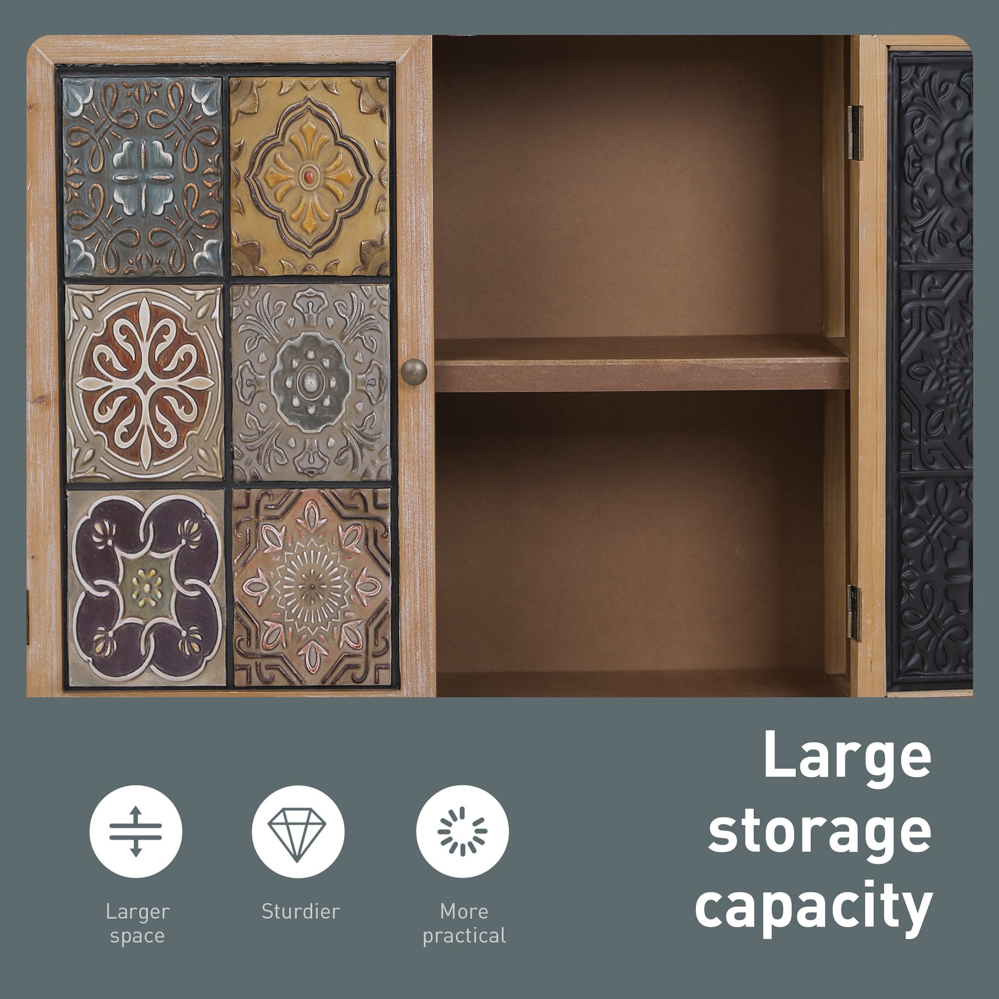Infuse your home with warm, rustic character. This charming cabinet welcomes with its distressed wood finish and antique-metal handles that evokes the simplicity of country living. Adorning the cabinet's front, the pattern consists of 12 weathered metal blocks displaying different floral meticulously arranged to create a visually striking and charming design. Beyond its authentic appeal, it serves as a steadfast organizer, offering a haven for your essentials and a generous surface for your favorite decorative accents. It's more than storage—it's a touch of enduring, cozy style for your living space.
