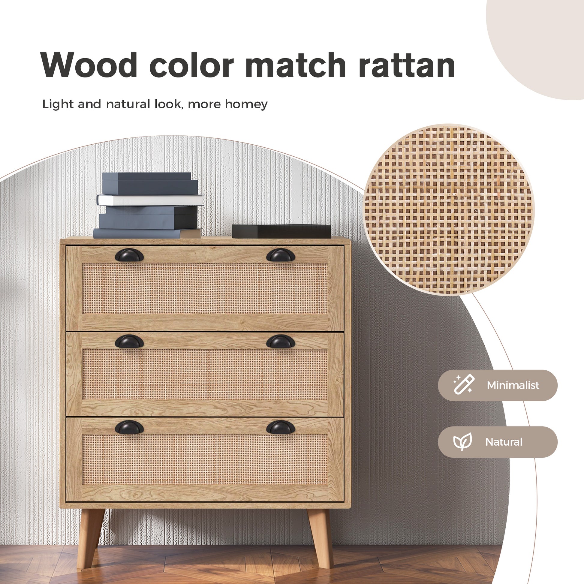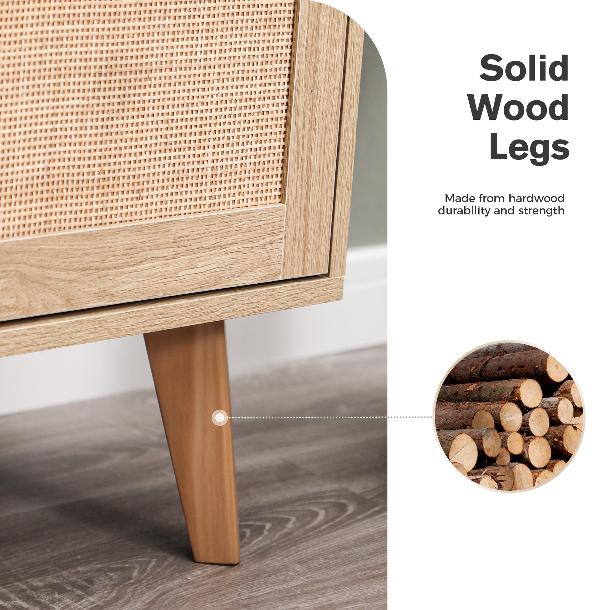 - Material: natural rattan surface decoration, high quality MDF board and solid wood legs