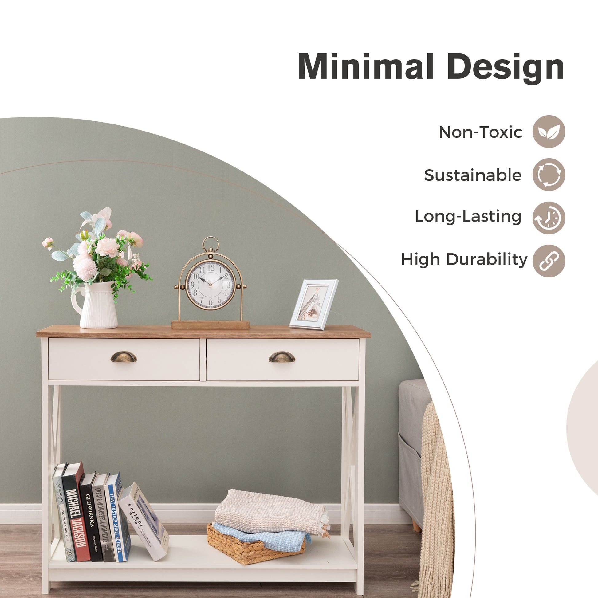 Bring warmth and rustic charm to your home with this beautifully crafted farmhouse console table. Available in two styles — with drawers for hidden storage or with open shelves for airy display — it’s designed to fit effortlessly in your entryway, hallway, or living room. The sturdy MDF construction with an X-shaped frame adds both strength and farmhouse elegance, while the soft ivory finish and wood-grain tabletop create a calm, inviting feel in any space.