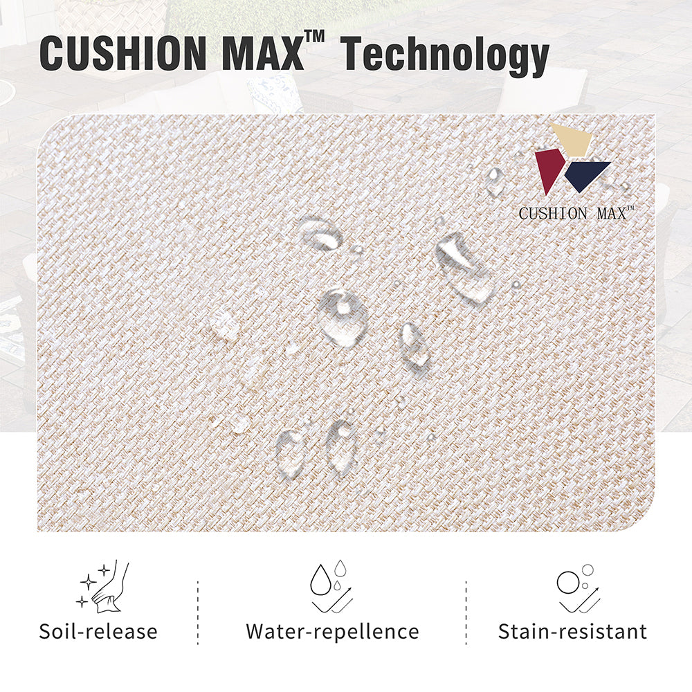 Waterproof & Low-Maintenance Cushions: CUSHION MAX technology fabric offers waterproof, anti-soiling, and UV-resistant properties. Easy-to-remove covers with zippers make cleaning a breeze, keeping the set looking fresh through all seasons.