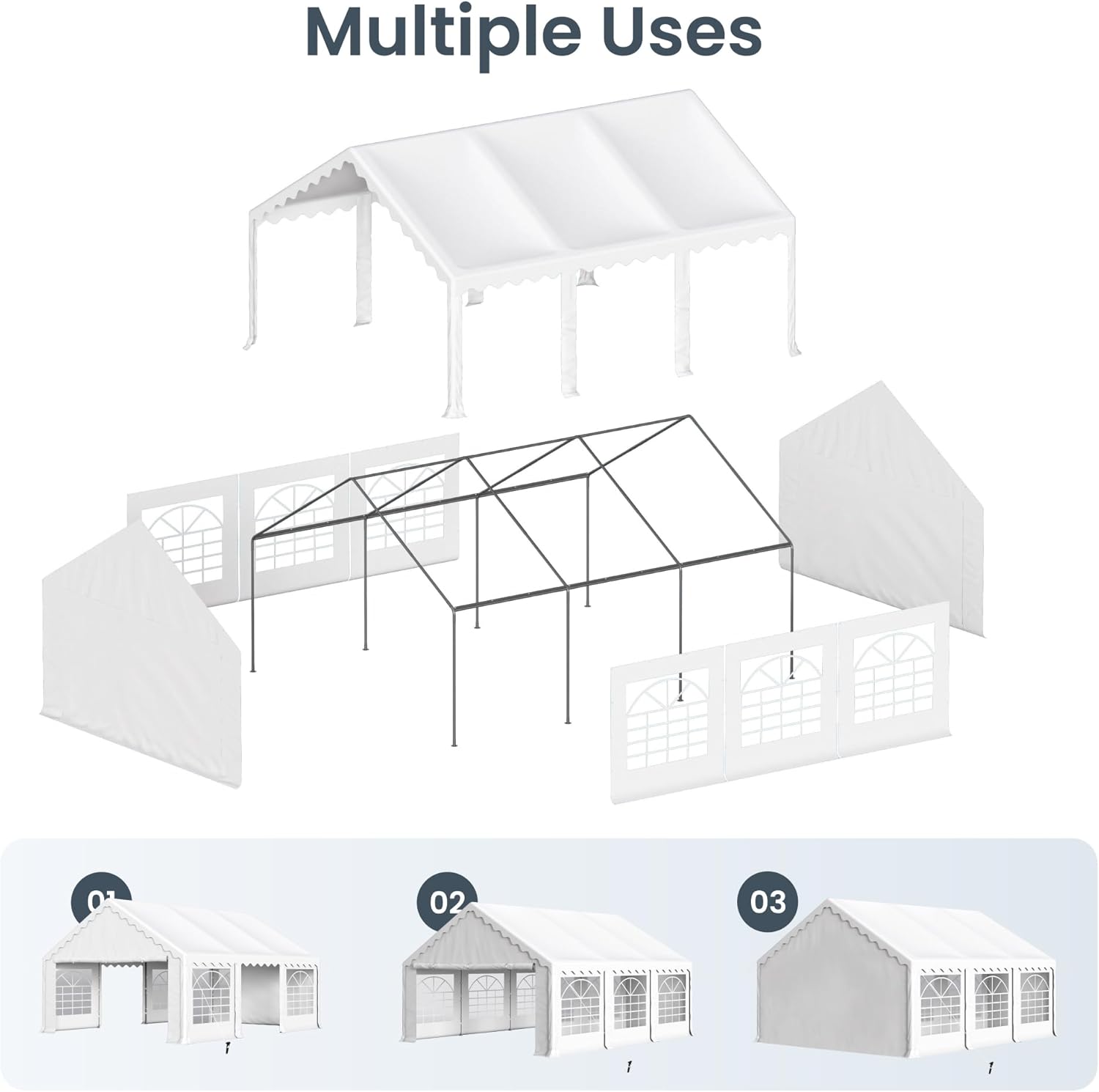 - 【Versatile Design】 This event gazebo is a multi-use shelter that is the perfect tent for commercial or recreational use such as weddings, parties, BBQ, carport, sun shade shelter, backyard events and so on. White sidewalls and white cover, make party decoration arrangement easy. Large external pole cover curtains hide frame poles and keep wind out.