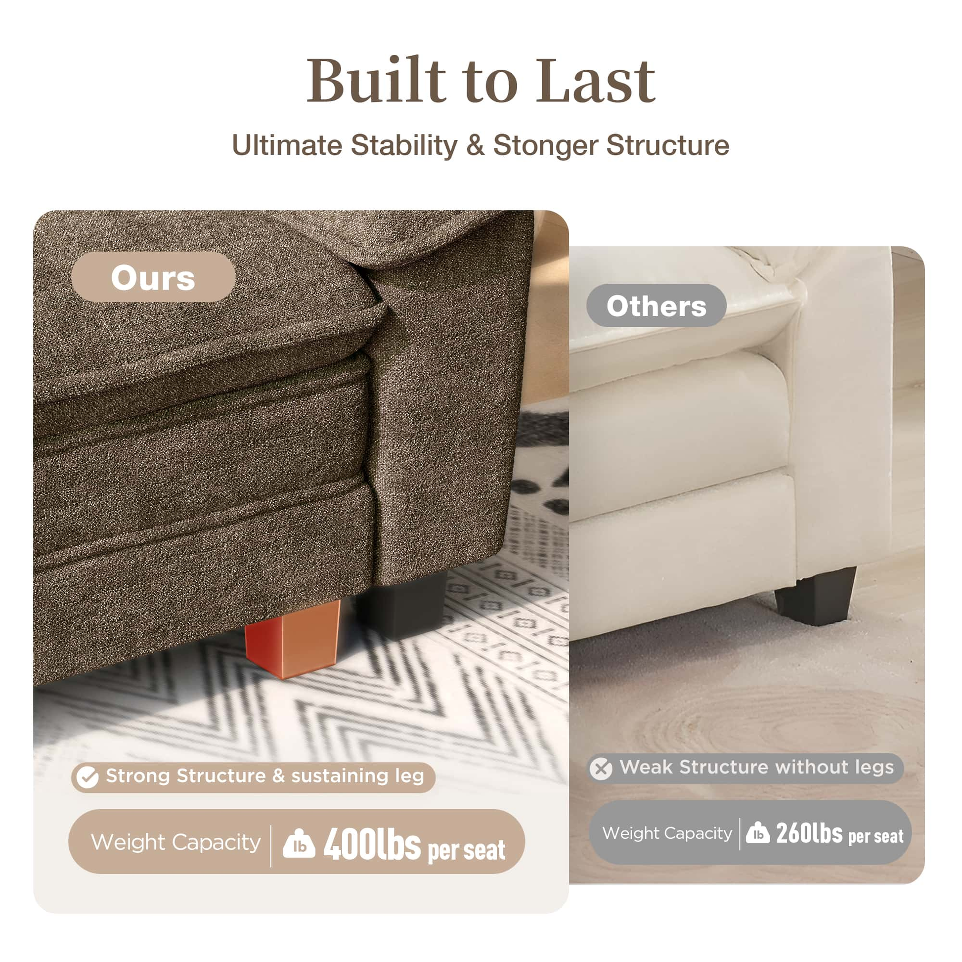 STRONGER STRUCTURE: Built for lasting comfort, our modular couch features solid wood back that resist compression and deformation, and the reinforced hardwood frame is squeak-free. For exceptional stability, this sofa provides sustaining feet with 400 lbs weight capacity