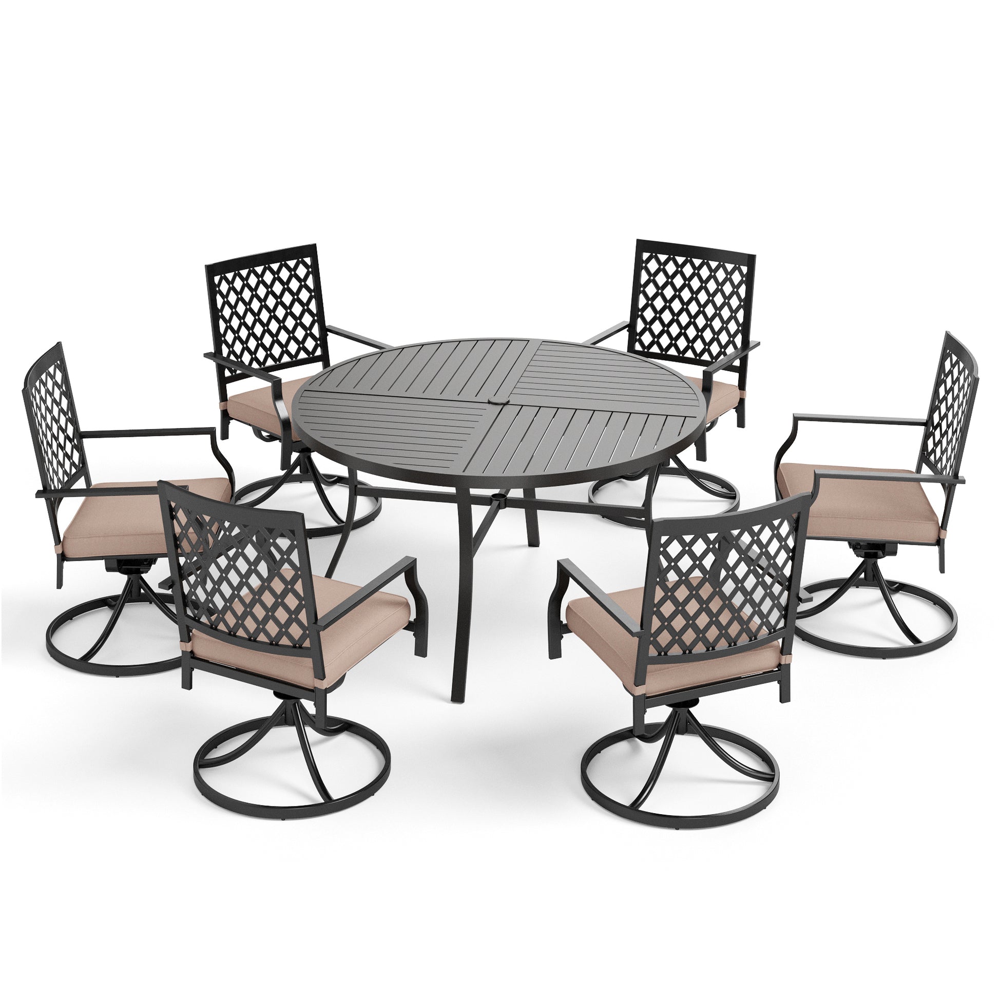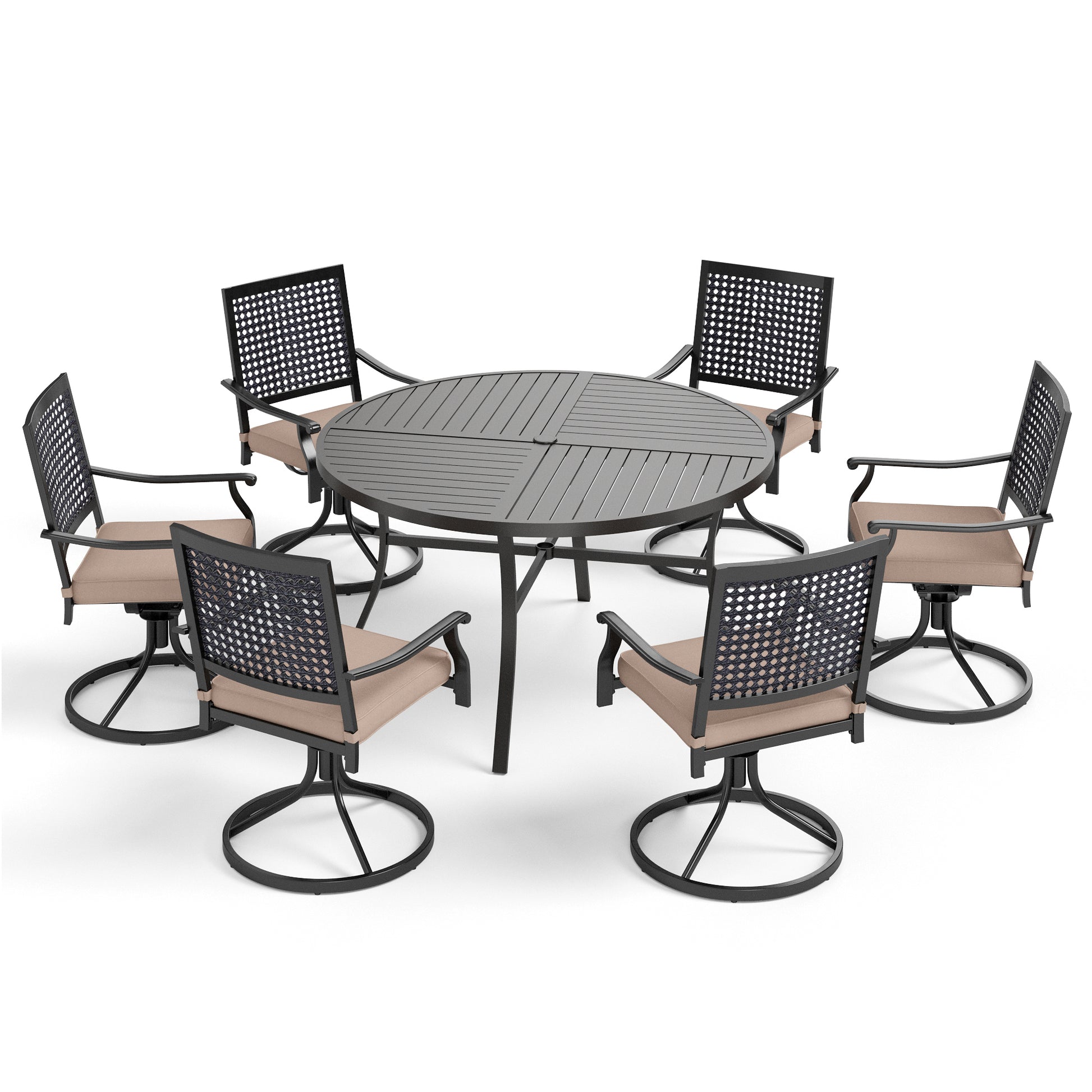 [<b>CAPTIVA DESIGNS</b>] Upgrade your outdoor dining with our 7-Piece Outdoor Dining Set, featuring a spacious 54" Round Table that comfortably seats 6 guests. The stylish slat tabletop is easy to maintain and includes a 1.57" umbrella hole for shade on sunny days. The chairs are stackable for compact storage convenience and their mesh-style back design combines comfort and style. Crafted from durable E-coated and powder-coated steel with robust cross leg connectors, this set is designed to withstand outdoor conditions for lasting enjoyment.