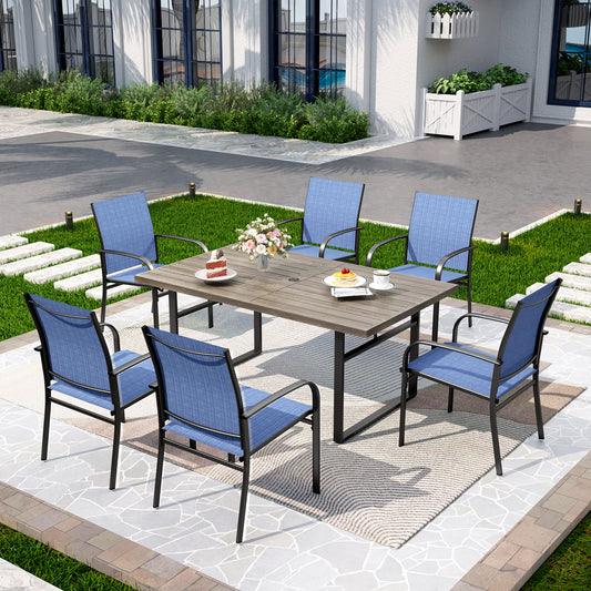 Captiva Designs 7 件套露台餐桌椅套装,配有户外木质板条钢桌和蓝色吊带固定椅