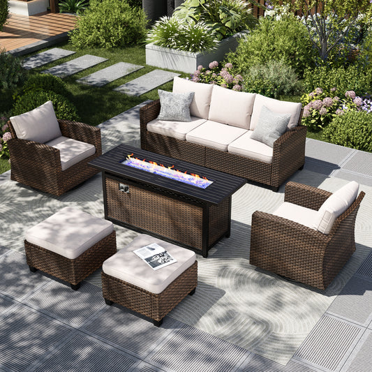 Captiva Designs 6 件套户外露台柳条藤条软垫火坑套装,配有脚凳和扶手椅
