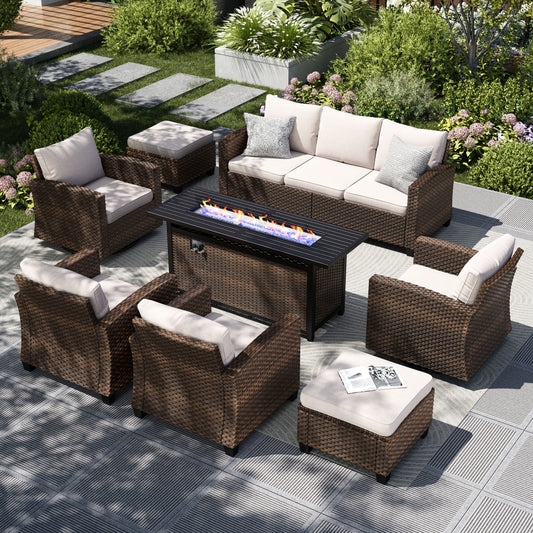 Captiva Designs 8pc Outdoor Patio Wicker Rattan Cushioned Sofa Fire Pit Set with Ottomans and Single Sofas