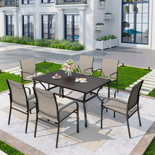 Captiva Designs 7 件套黑色圆形板条钢桌,带伞孔和棕色 Textilene 椅子