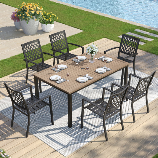 Captiva Designs 7 件套露台餐厅 U 型腿木质长方形桌子和金属可堆叠椅子,带剥离式靠背